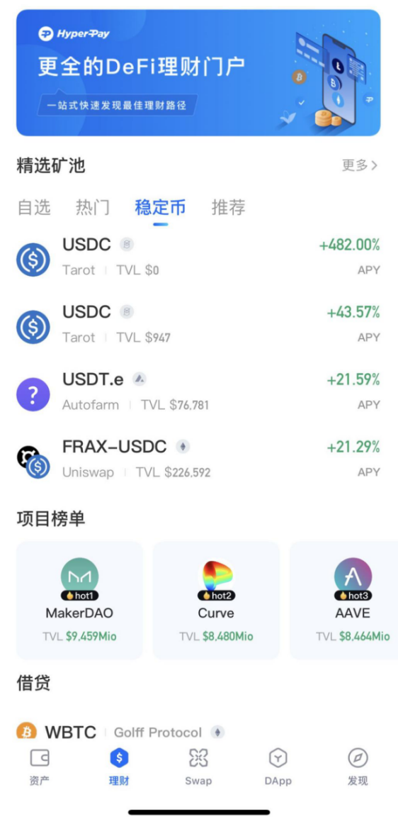 HyperPay5.0自管钱包增加了丰富的理财功能模块,挖矿、借贷、DeFi理财等多种产品满足用户的各种投资需求。喜欢DeFi的用户,可以在这儿体验一站式的理财项目,不过这还不算特色,5.0的自管钱包特别甄选了市场头部、热门DeFi项目,并通过多维度对项目进行安全检测,方便新手用户直观稳健的参与DeFi项目。用户在体验理财版块时,可以勾选自己偏好的资产,理财版块也将按照用户的偏好推荐相应的DeFi项目并展示TVL、APY等相应数据信息: