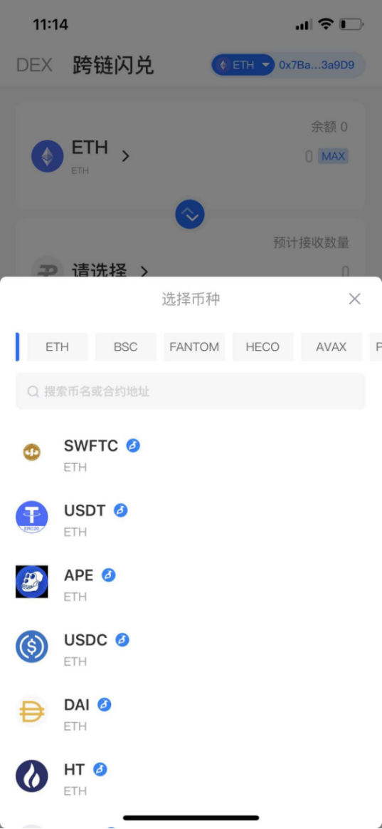 跨链闪兑功能支持7条公链(ETH、BSC、FANTOM、HECO、POLYGON、OEC、AVAX)任意两个币种进行兑换,帮助用户轻松完成不同公链、不同资产之间的兑换: