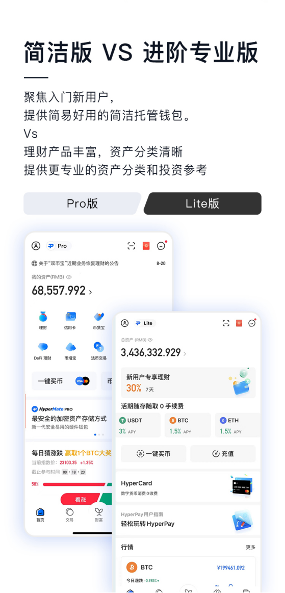 5.0版本也是HyperPay钱包发展过程中的一个重要节点,在该版本中,托管钱包和自管钱包完全独立,业务拓展性更强,前端页面更为人性化,托管钱包分为简洁版和专业版,针对不同用户群体提供更友好的交互体验和服务内容。