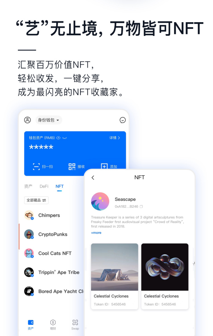 HyperPay自管钱包支持30+公链及公链衍生资产,覆盖市场主流公链,用户可以添加自己需要的公链资产,无需多个钱包间切换,持有资产明细一目了然,并且在5.0版本中,用户可以进行NFT收藏与分享: