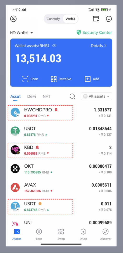 1 Open the HyperPay Web3 wallet and enter the Asset home page, risky tokens are marked in the asset list, as well as their risk levels, which are general risk or high-risk.