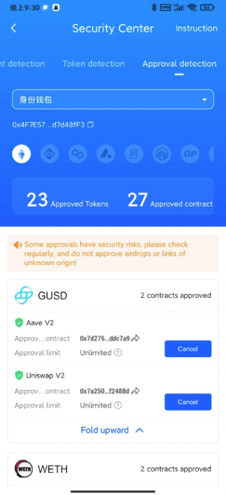 1 After entering the security center, select the approval detection tab to detect the token approval status of the current wallet, and you can see which tokens in the wallet are approved for which protocols, the number of approvals, and the approved contracts whether there is a risk.