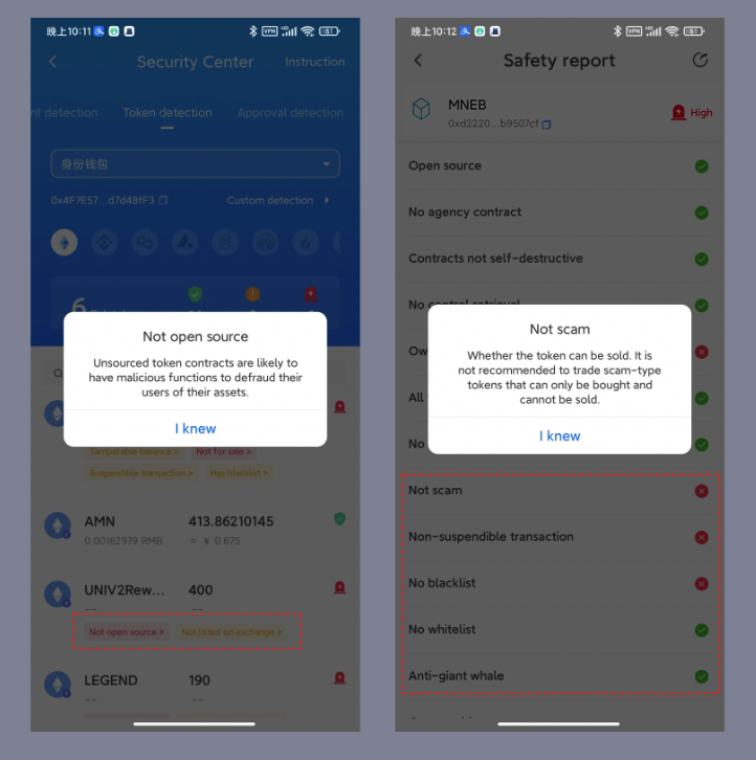 4 Users can click the risk label distinguished by color below the token to view the risk description, click the token to view the detailed detection report, where gives specific detection items and descriptions.