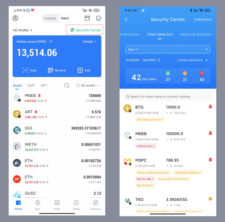 3 Users can also click Security Center on the Asset homepage, select the token detection tab, and after entering, the security detection on the current wallet token will be performed automatically.