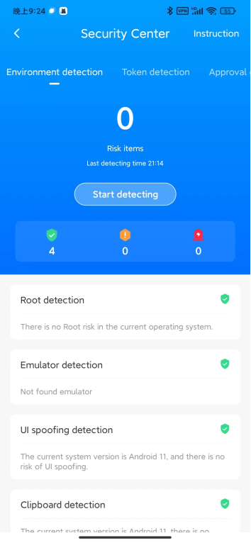 HyperPay Security Center currently provides three security detection features: environment detection, token security detection and approval detection. In addition, the approval detection module supports modifying/canceling the approval.