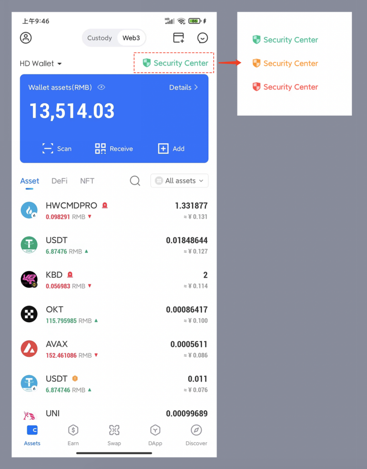 1 Every time you open the HyperPay wallet, the environment security detection will be automatically started in the background, and users can intuitively see the security status of the current environment according to the color of the Security Center icon on the Asset home page.