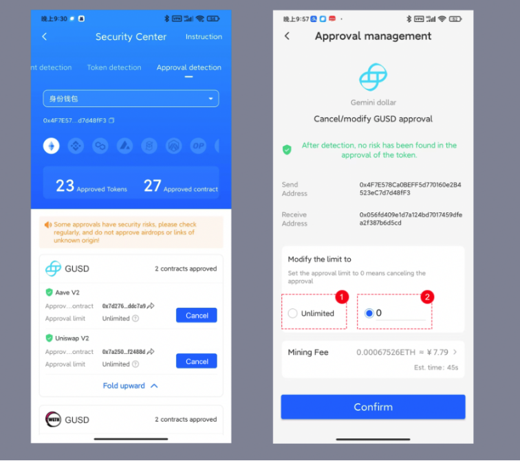 2 Users can click the Cancel button to modify or cancel the approval. The red box 1 is to modify the quota of the token to unlimited, and red box 2 is the custom approval quota, setting the approval limit to 0 to cancel the approval.