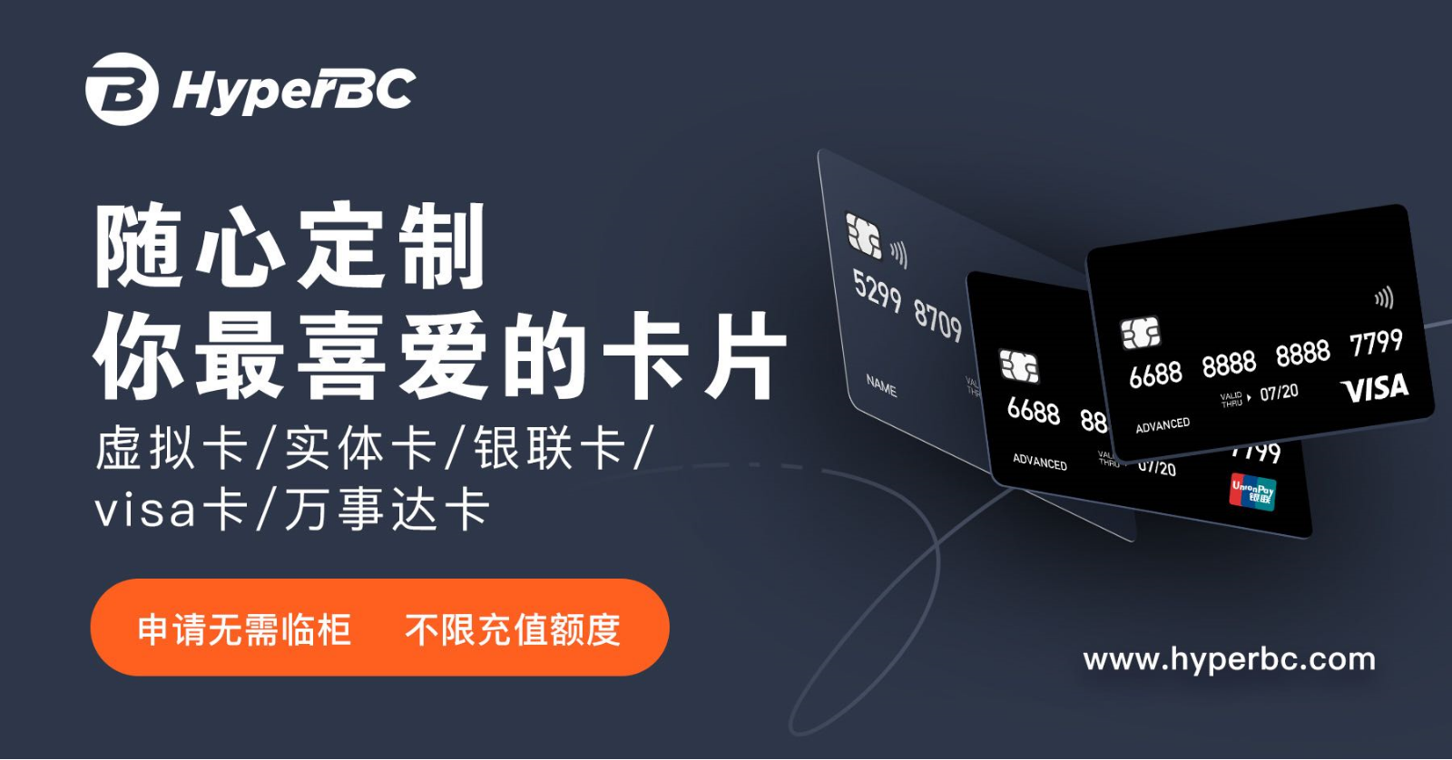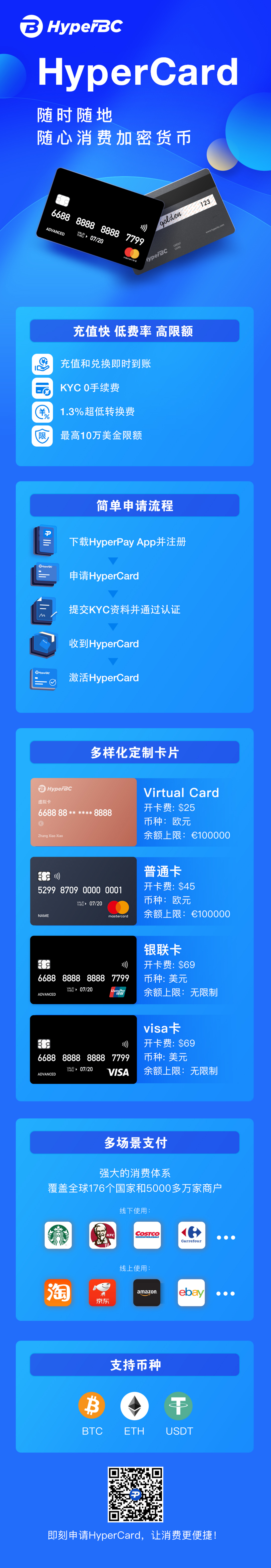 HyperBC作为一家面向未来的加密资产银行,致力于为用户提供更为便捷的加密资产金融服务,在当前趋势下,推出了加密资产预付卡:HyperCard,集跨境支付、消费、资产存储、闪电兑换为一体。