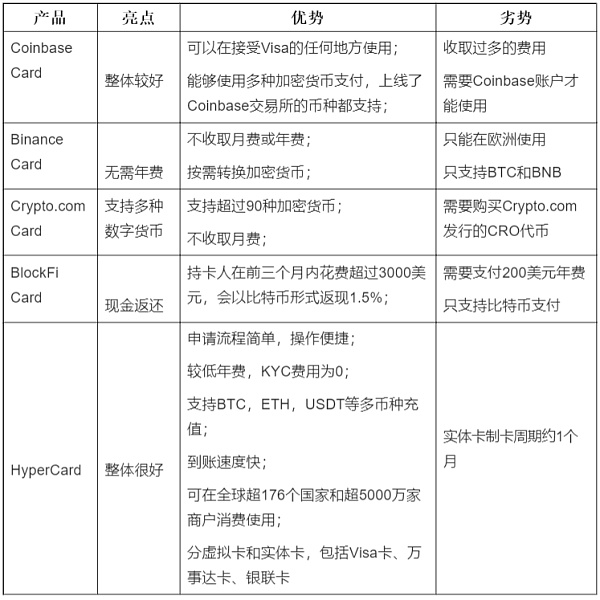 当前市场上也有其他加密资产信用卡服务如:Coinbase Card、Binance Card、Crypto.com Card、BlockFi Card,在此简单列表:
