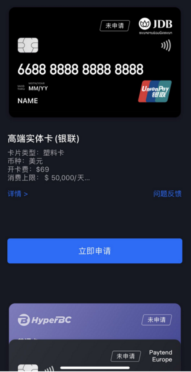 用户可以在支持HyperCard使用的场景中购买任意商品,每日最高限额10万美金,部分卡片充值无上限;