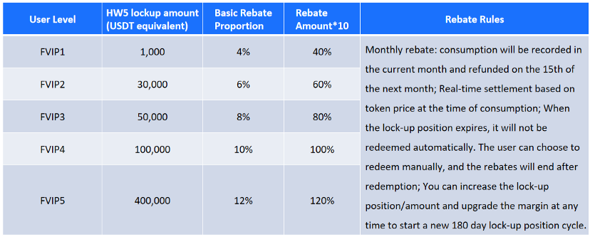 The platform has introduced HW5 lock-up rules, offering 4% — 12% of consumption as rebates. The proportion of the consumption rebate at the initial stage of the activity can be increased up to 120% through locking for hyper rebate card users. It creates an innovative mining model of credit card consumption PoP (Proof of Participation). After the user locks HW5, they receive following incentives: