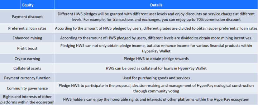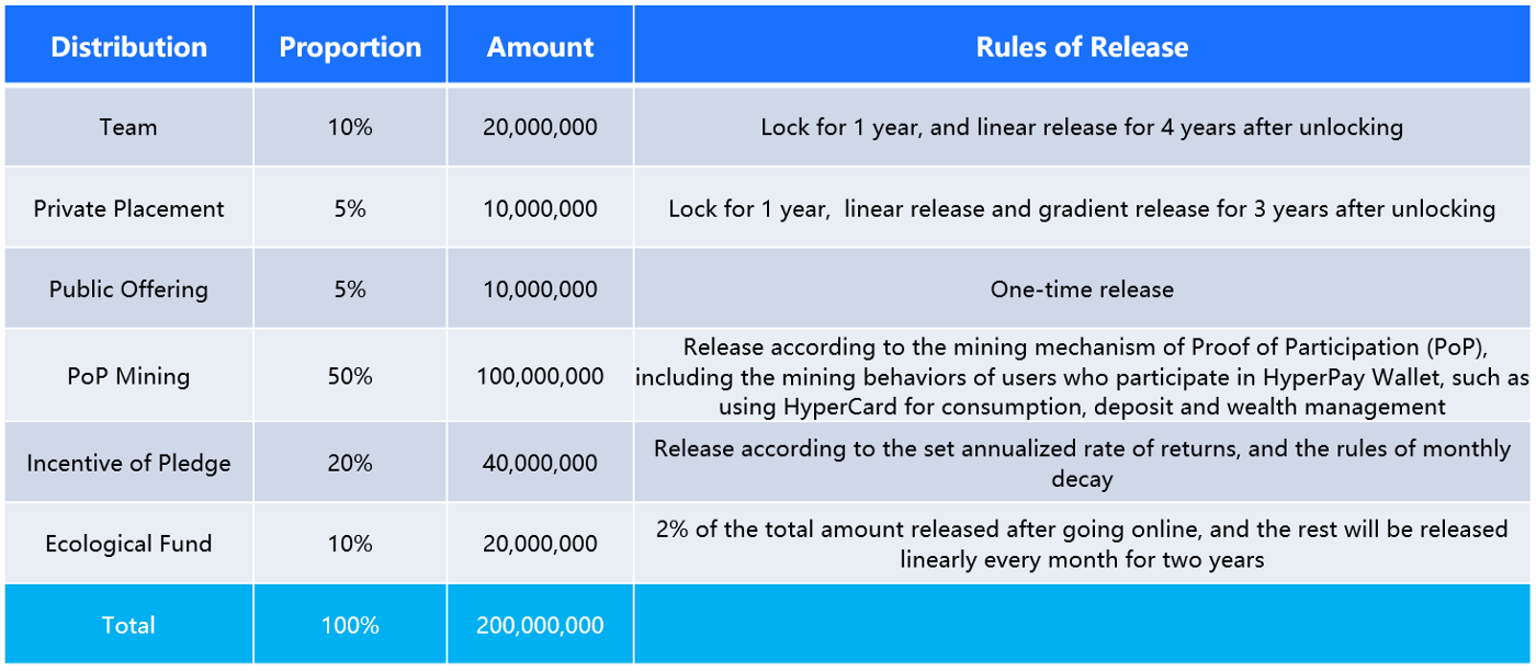 HW5, the first Web5 digital bank token, is the backbone of HyperPay ecosystem, and adopts the PoP (Proof of Participation) mining mode, that is, users conduct mining within the HyperPay Wallet, including consumption with HyperCard, deposit, investment, loan, transaction. This encourages behaviors that increase liquidity, stabilising markets in the long term.