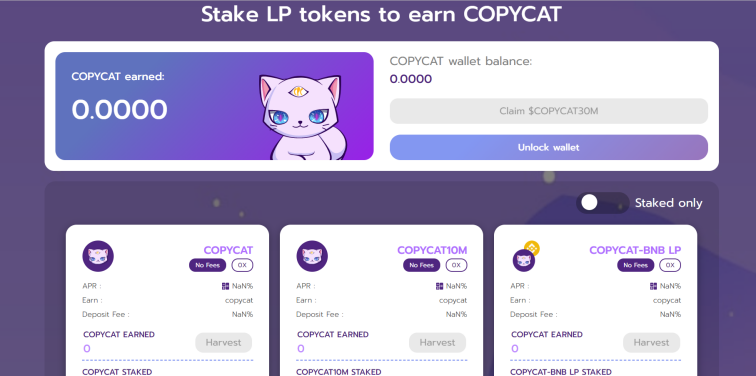 Copycat Finance 是 BSC 上排名第一的分布式跟随交易平台(Copy Trading)和跟随挖矿平台(Copy Farming)。COPYCAT 是该平台的主要实用 Token,可用于支付主交易员的注册费、追随者的存款/提款费、NFT 和许多交易比赛,也可以进行质押,从而获得奖励。简单来说,Copycat Finance 是一个去中心化的带单平台。