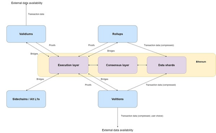 当前,以太坊社区同时在使用链下扩容性策略和链上扩容策略。链下扩容 (off-chain scaling)是指为以太坊等底层链提供外部执行的任何创新方式。人们将这些创新称为「Layer 2」(简称 L2), 也即将交易的执行放在以太坊之外的第二层网络进行,从而优化以太坊 L1 的性能。链上扩容 (on-chain scaling) 是指为了提高区块链的吞吐量 (即每秒能够处理的交易量) 而对其进行的任何直接修改。虽然诸如 Rollups 和 Validiums 等链下扩容方案会在短期内扩展以太坊,但以太坊网络的长期补充策略是实现分片 (sharding),也即将以太坊 L1 分成许多条有着共享安全性的分片链 (shard chains)。