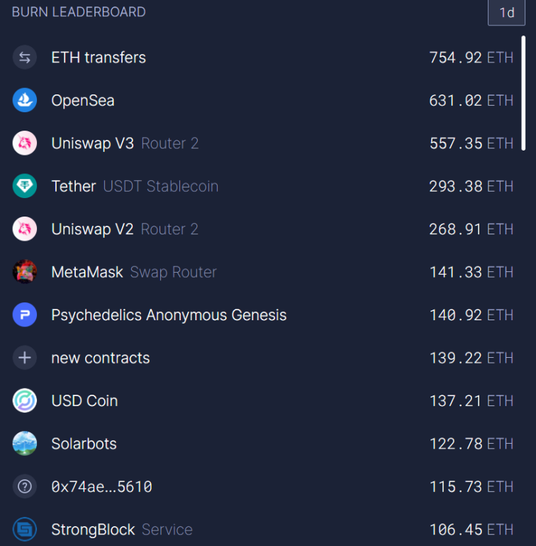 当前以太坊链上的主流应用,每天燃烧的以太坊价值达百万美元。