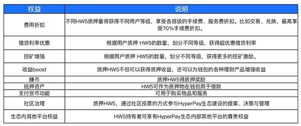 HW5(Web5数字银行通证)是HyperPay超级金融支付网络的支柱。HW5采用PoP(Proof of Participation)挖矿模式,即用户通过参与HyperPay钱包业务进行挖矿。包括HyperCard消费、充值、用户理财、借贷、交易等诸多用户行为。