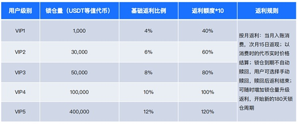使用HyperCard至尊返利卡,用户锁仓HW5,在4%-12%的基础消费返利的基础上,再扩大10倍返利,即最高返利达120%。HW5开创了信用卡消费PoP(ProofofParticipation)挖矿创新模式。用户锁仓HW5后,还会有以下激励: