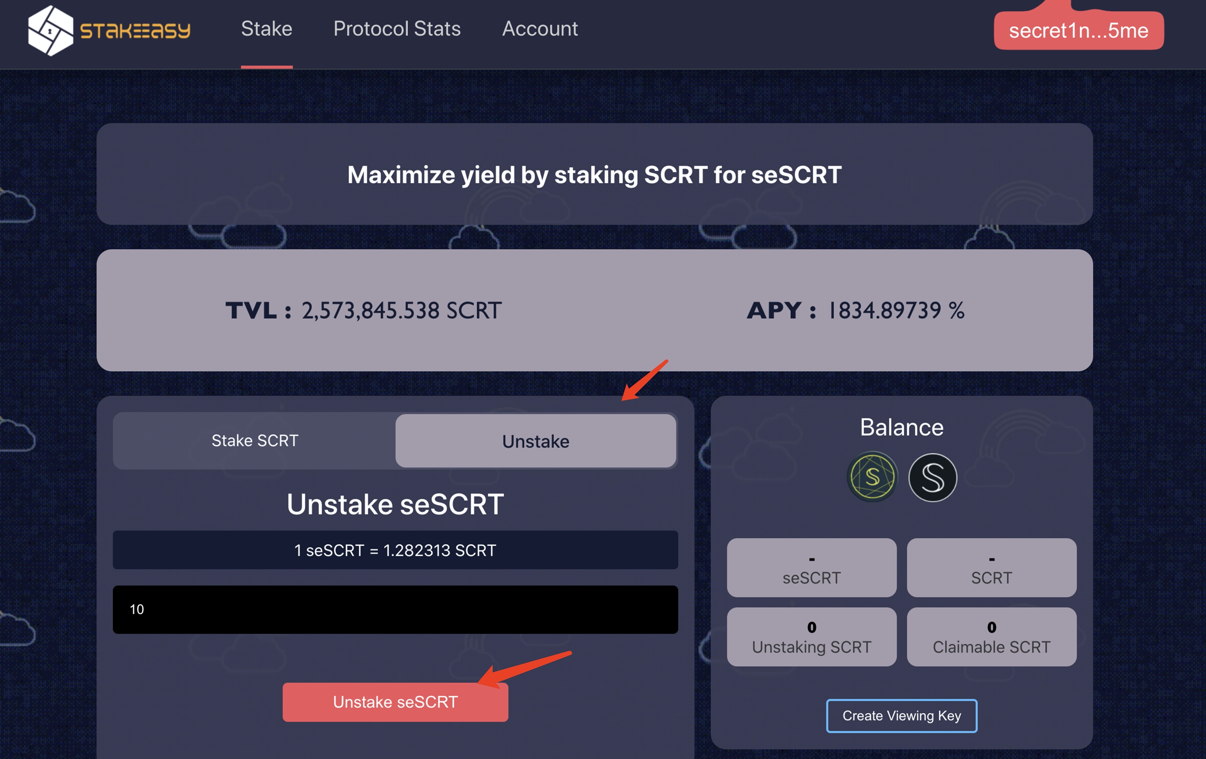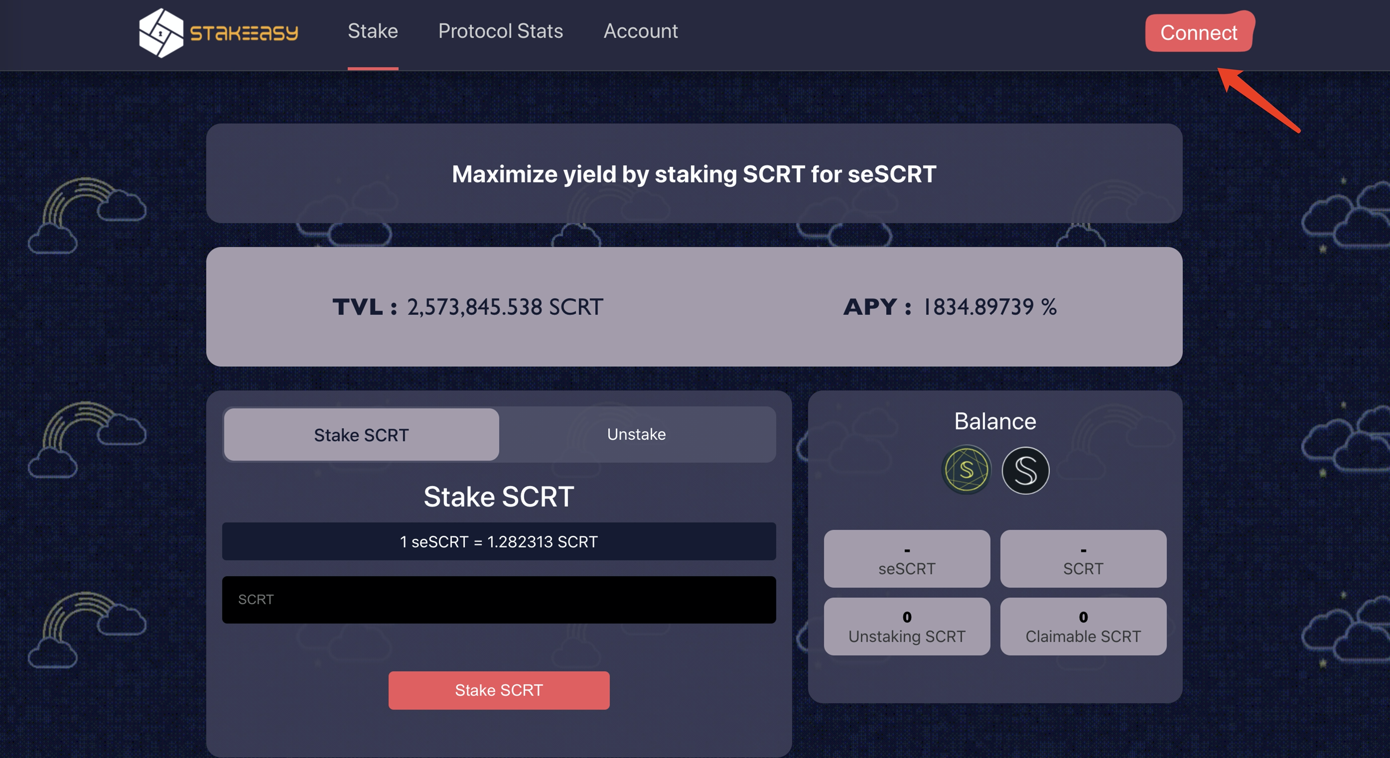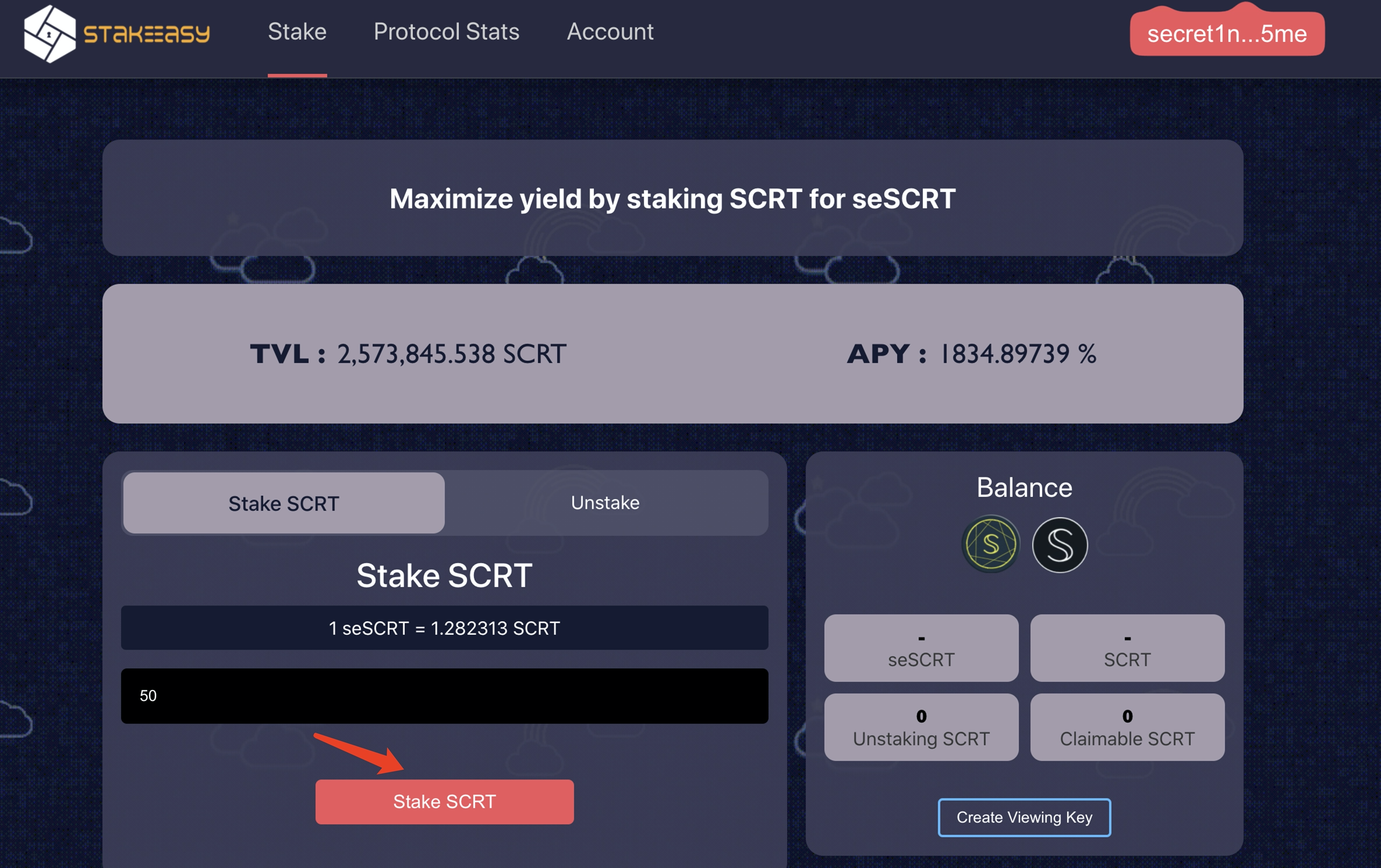 用户可以在 StakeEasy 上质押他们的 $SCRT 代币,并获得一个 SNIP-20 代币 $seSCRT 作为回报,随着质押奖励在平台上累积,价值会增加。$seSCRT 可以转移到另一个钱包,也可以在 DeFi 协议中用于提供流动性或用作抵押品。