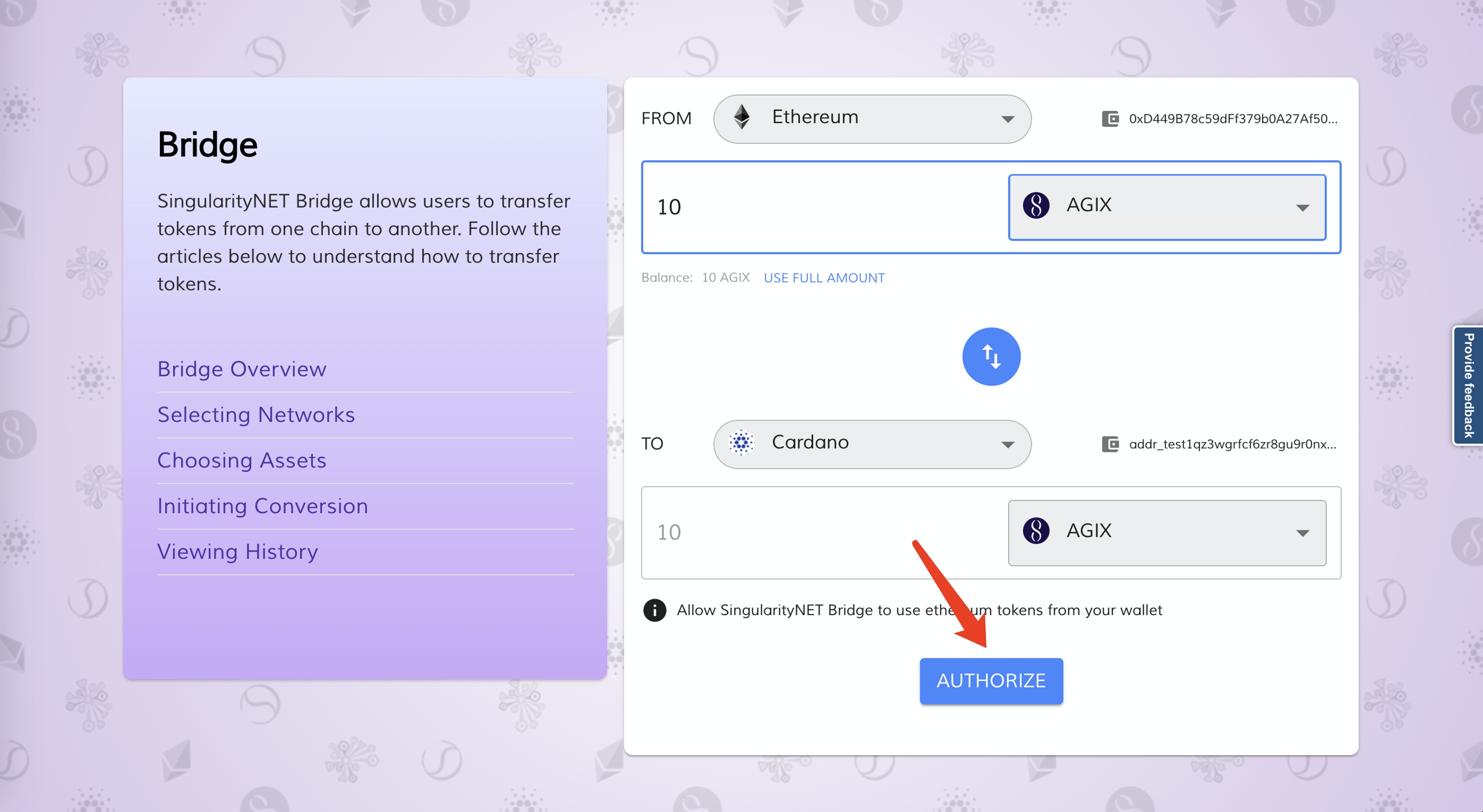 Ethereum跨到Cardano(输入数量,点击点击AUTHORIZE授权)