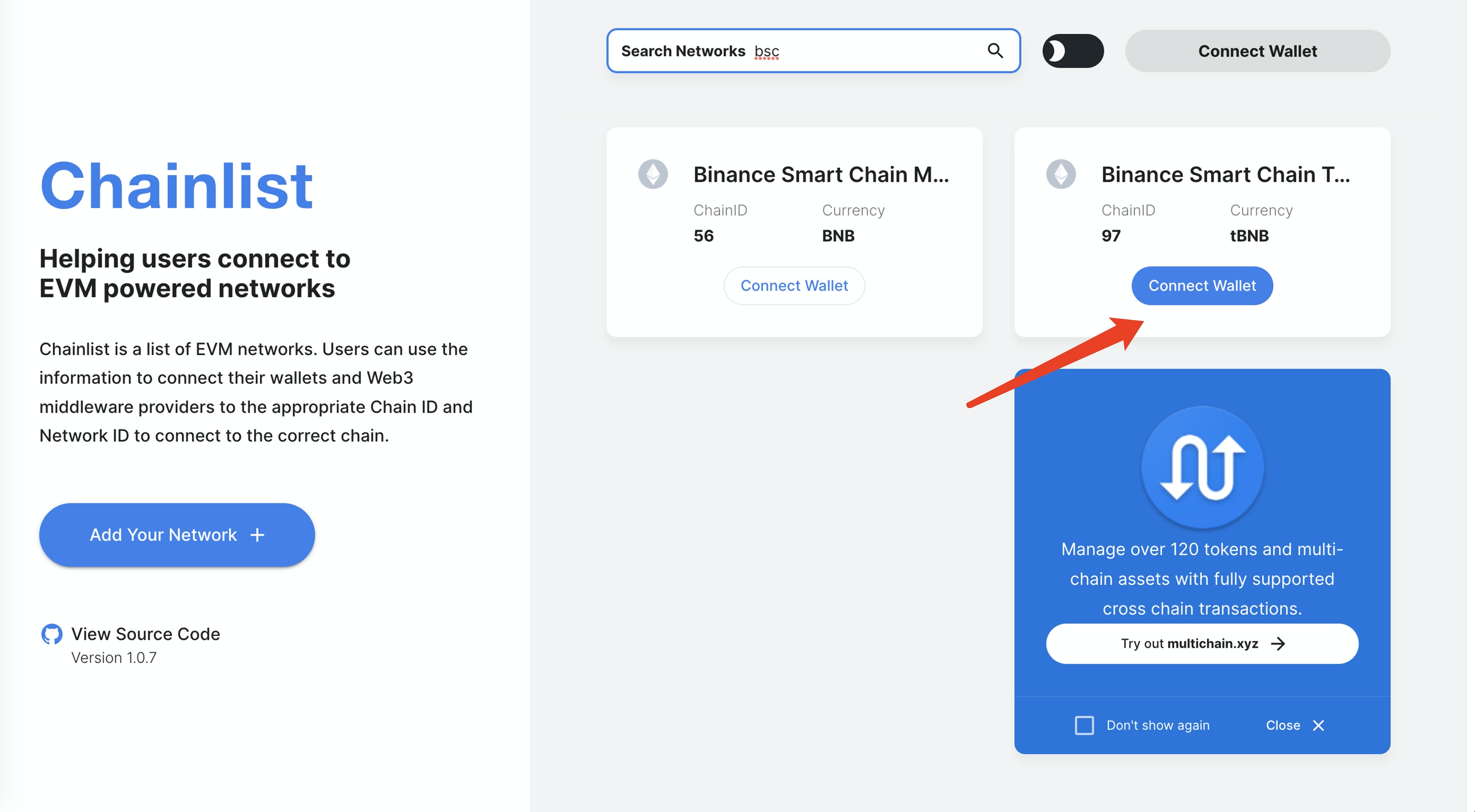 1)钱包切换到BSC测试网。这里可以用chainlist.info设置。