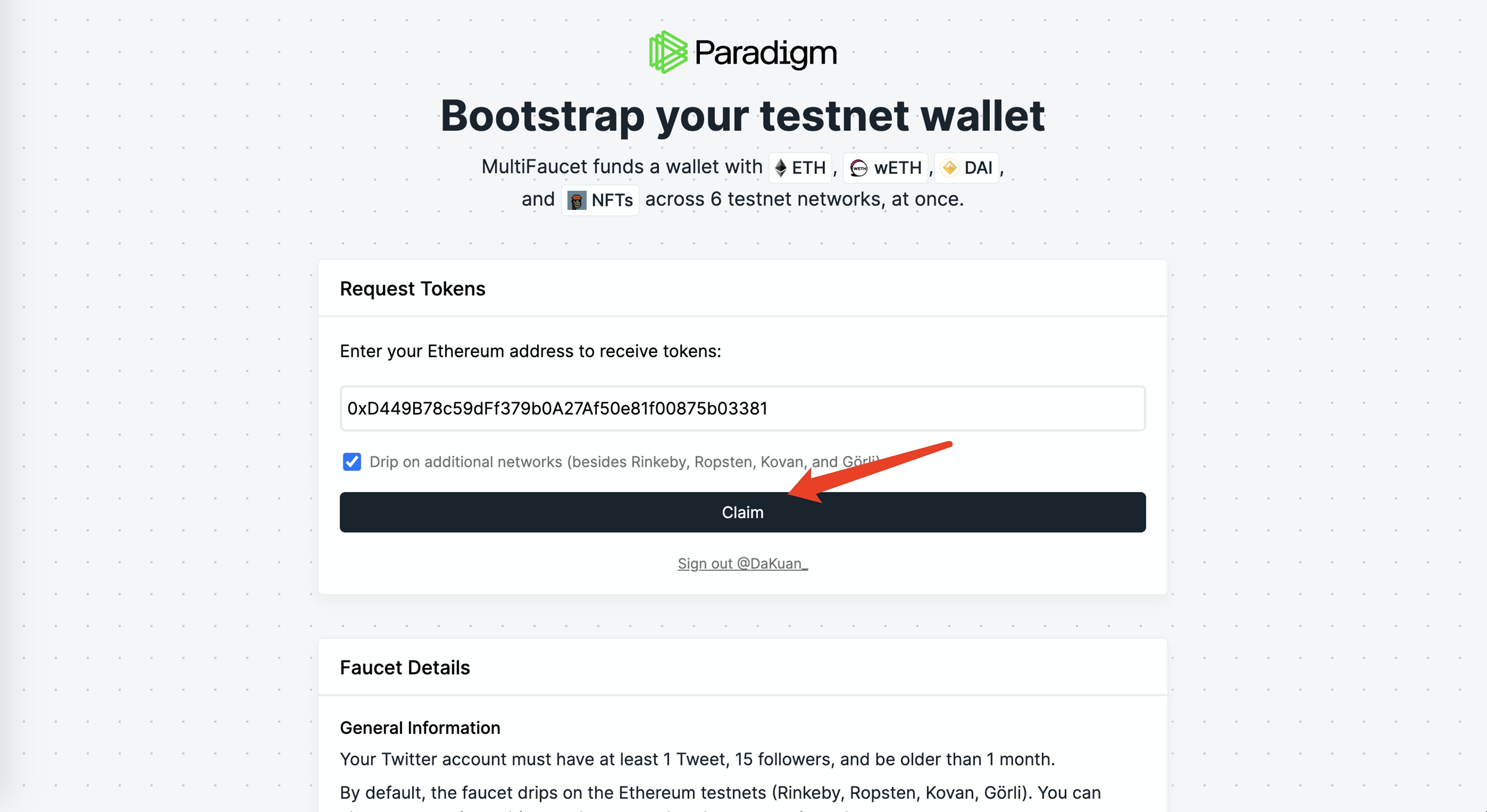 2 领取测试代币(需要登入推特,每个推特24小时只能领取一次。)
