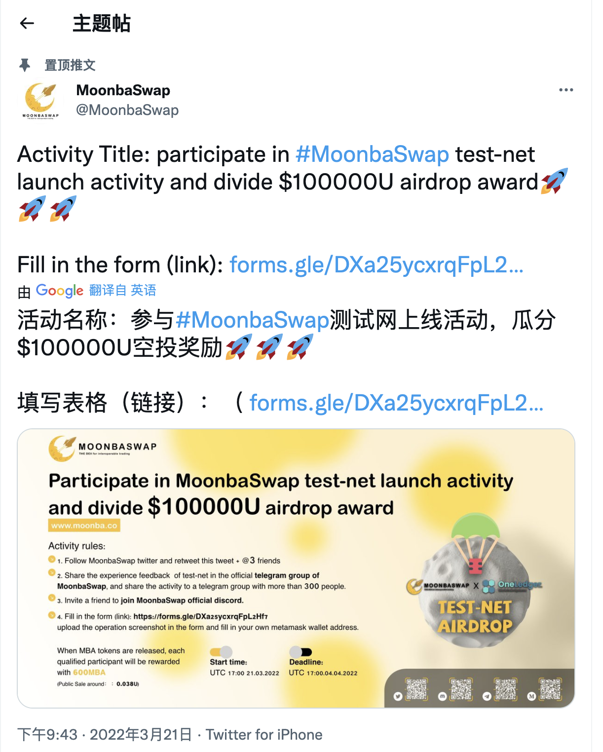 活动时间:2022 年 3 月 21 日启动。参与测试网活动,瓜分$100000U空投奖励