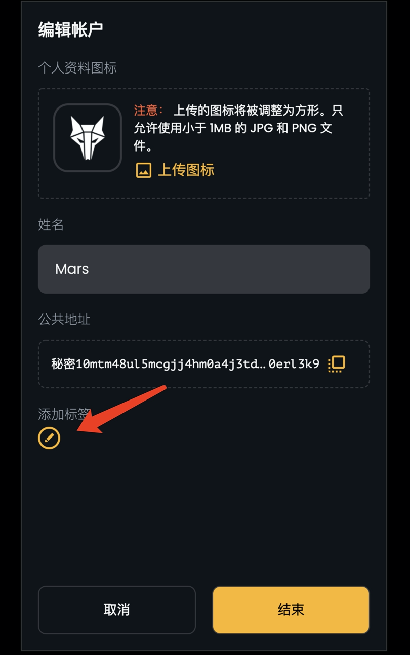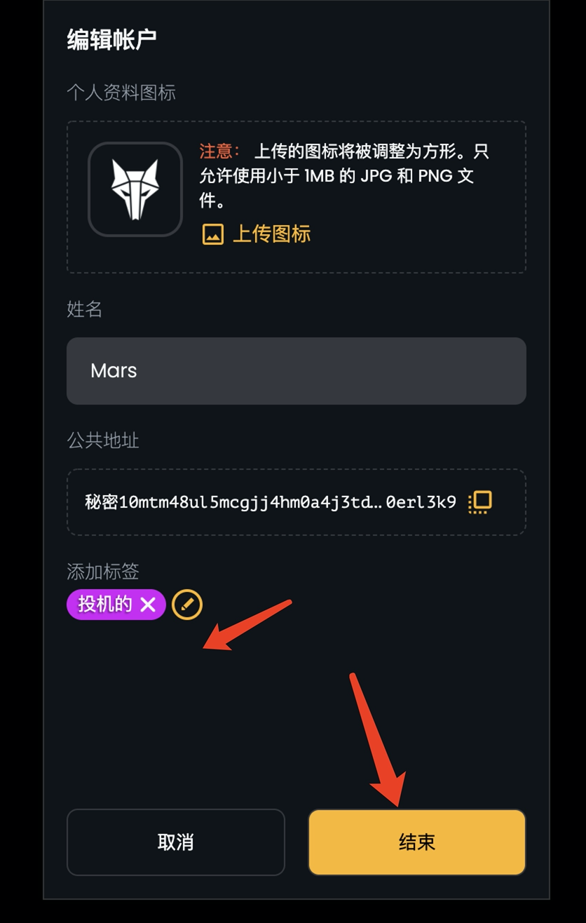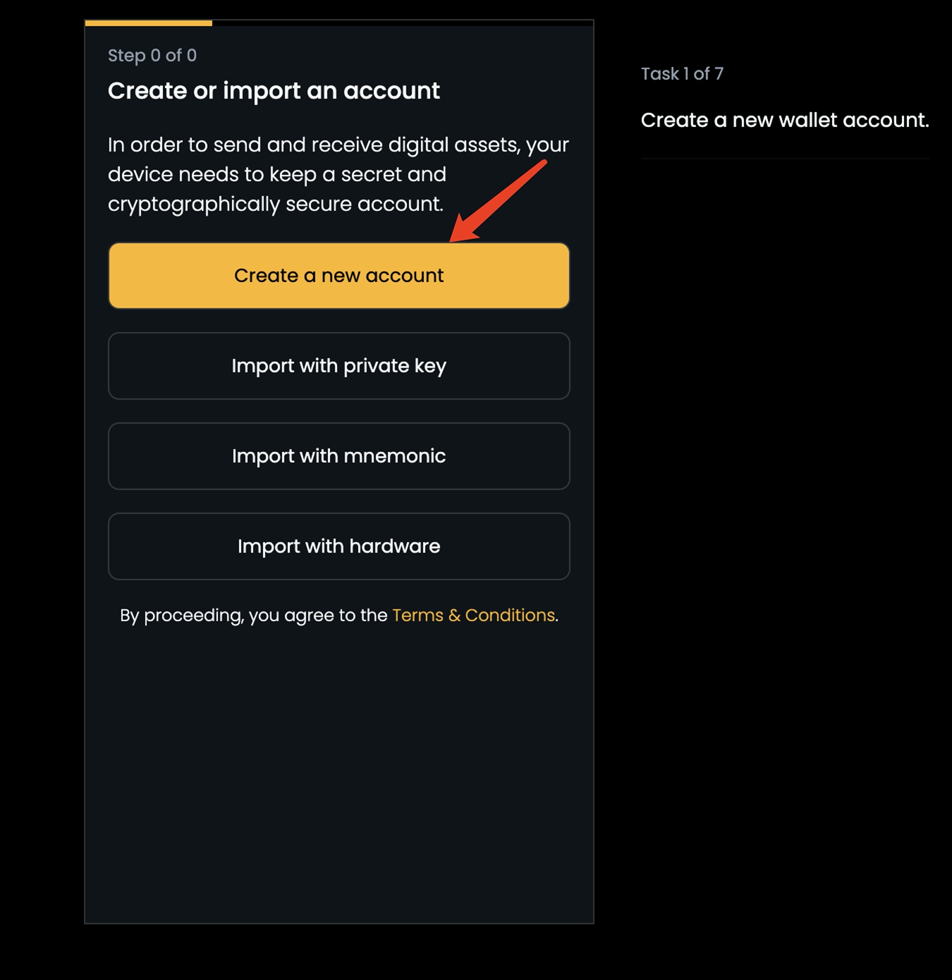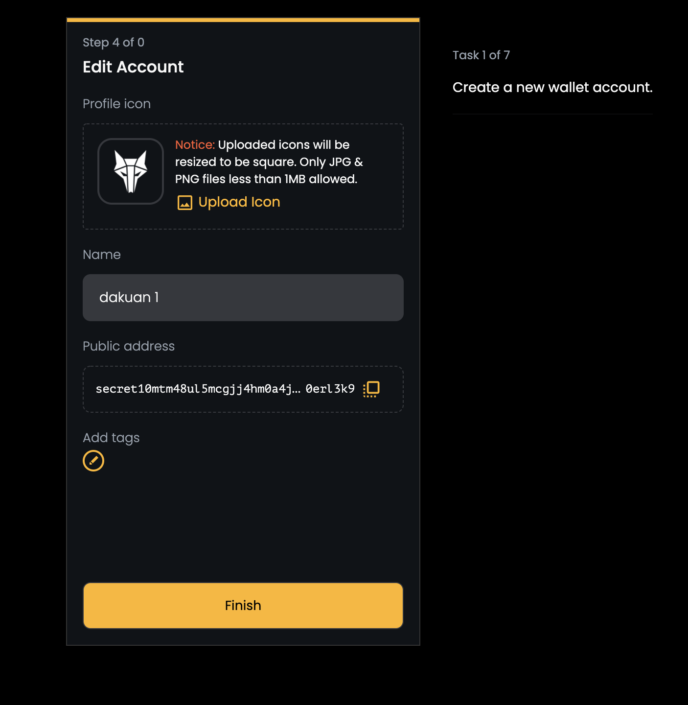 4 点击创建账户,记下助记词并继续。验证助记词以后 修改钱包名称并点击Finish。