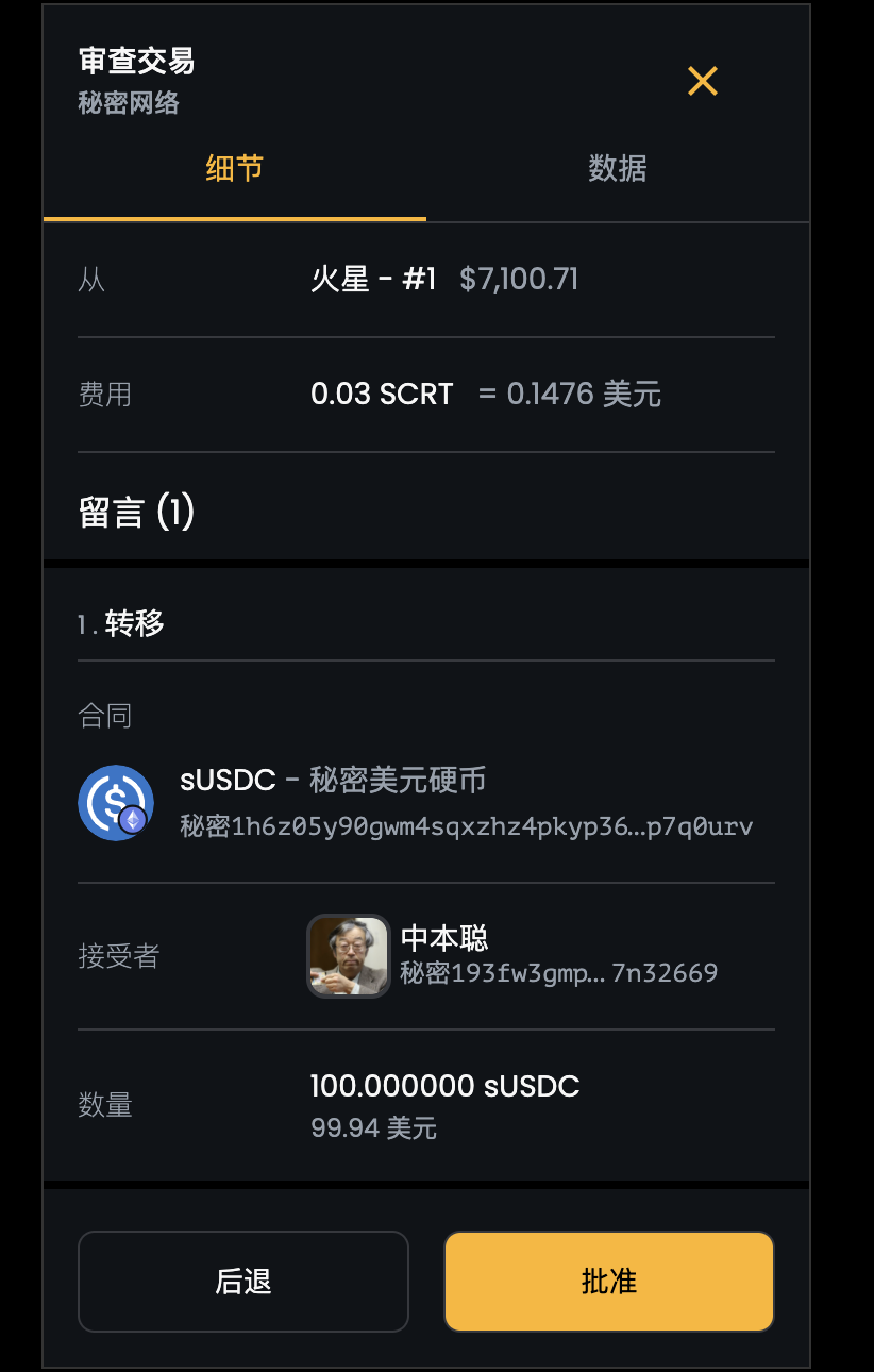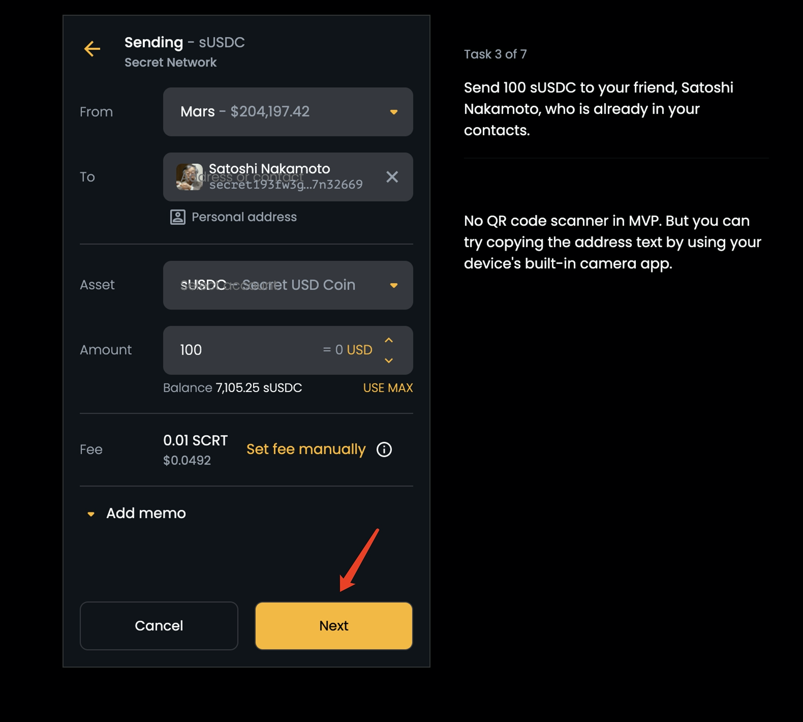 8 发送100 sUSDC给您的朋友 Satoshi Nakamoto,联系人中选择。