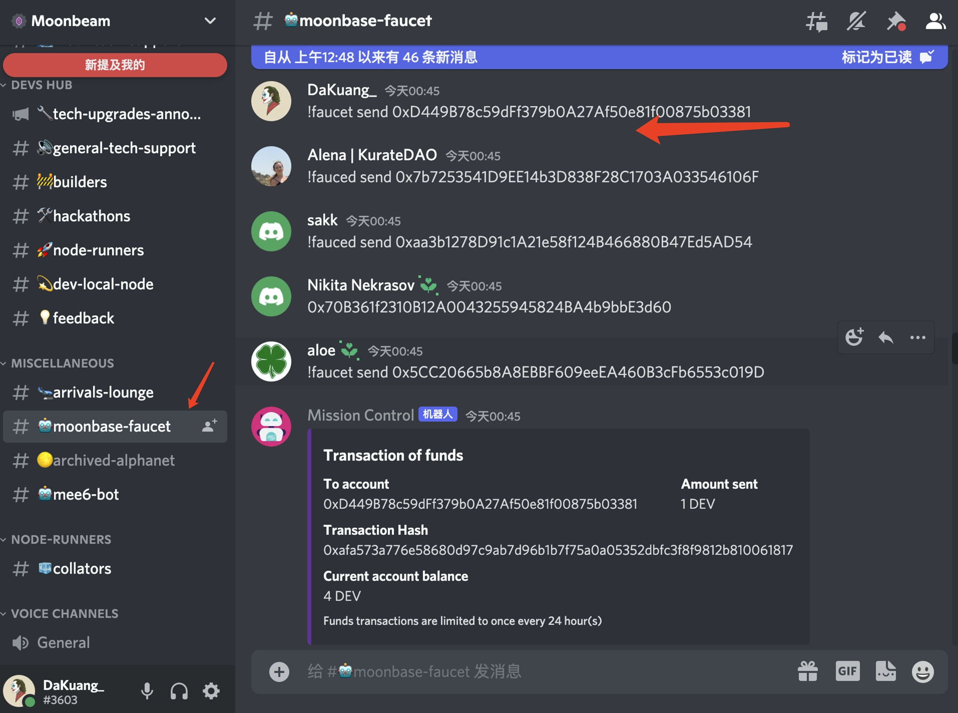 3 领取测试代币,加入DC群到水龙头频道领取。(输入!faucet send空隔➕地址)
