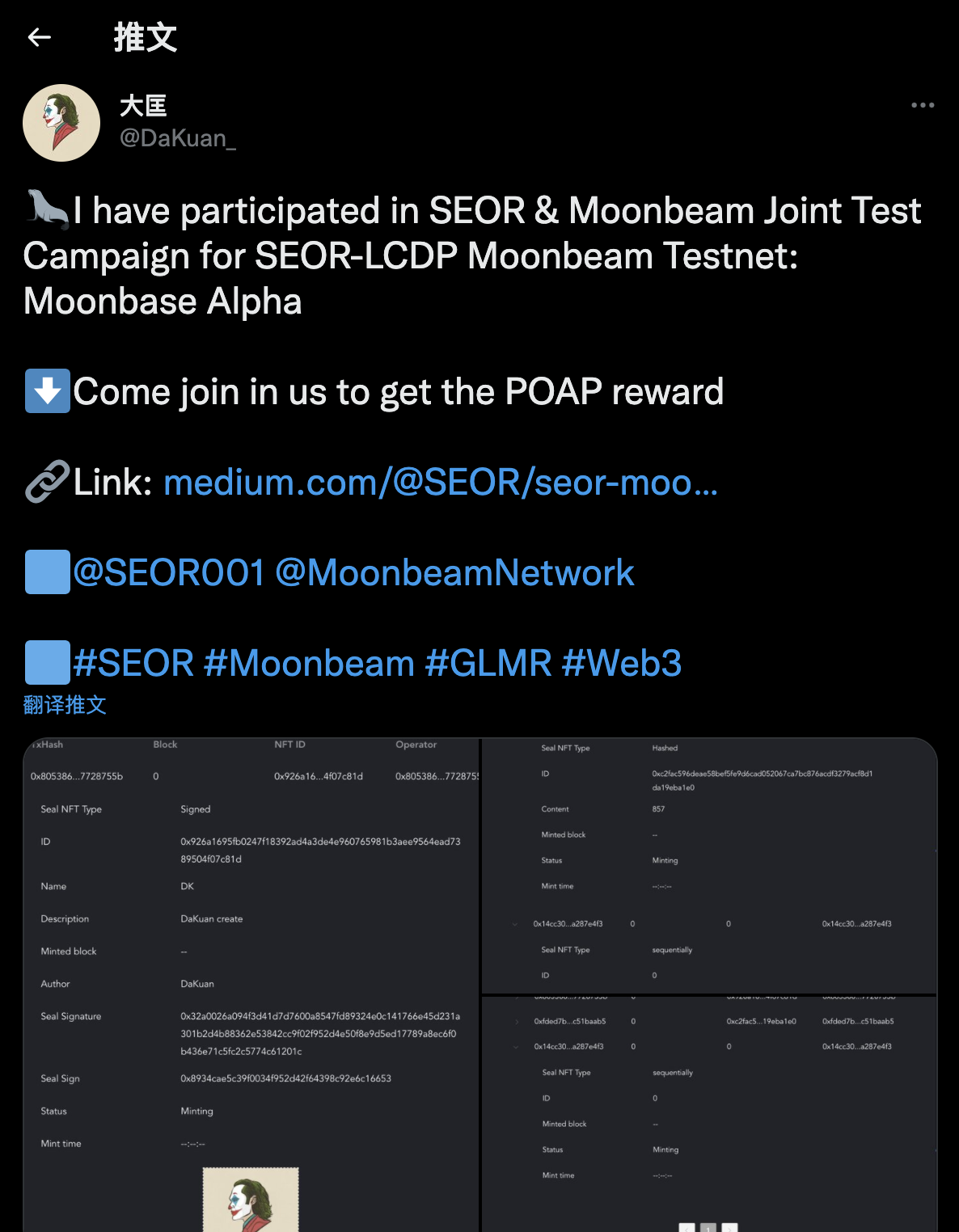 🦭I have participated in SEOR & Moonbeam Joint Test Campaign for SEOR-LCDP Moonbeam Testnet: Moonbase Alpha⬇️Come join in us to get the POAP reward🔗Link: https://medium.com/@SEOR/seor-moonbeam-joint-test-campaign-for-seor-lcdp-moonbeam-testnet-moonbase-alpha-ba1e46f071e5🟦@SEOR001 @MoonbeamNetwork🟦#SEOR #Moonbeam #GLMR #Web3