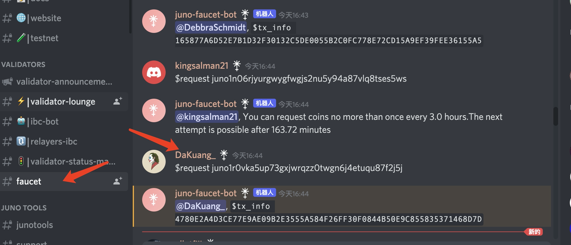 进入官方https://discord.gg/fWaskuch找到水龙头频道发送$request 空格粘贴JunoUniTestnet测试网地址