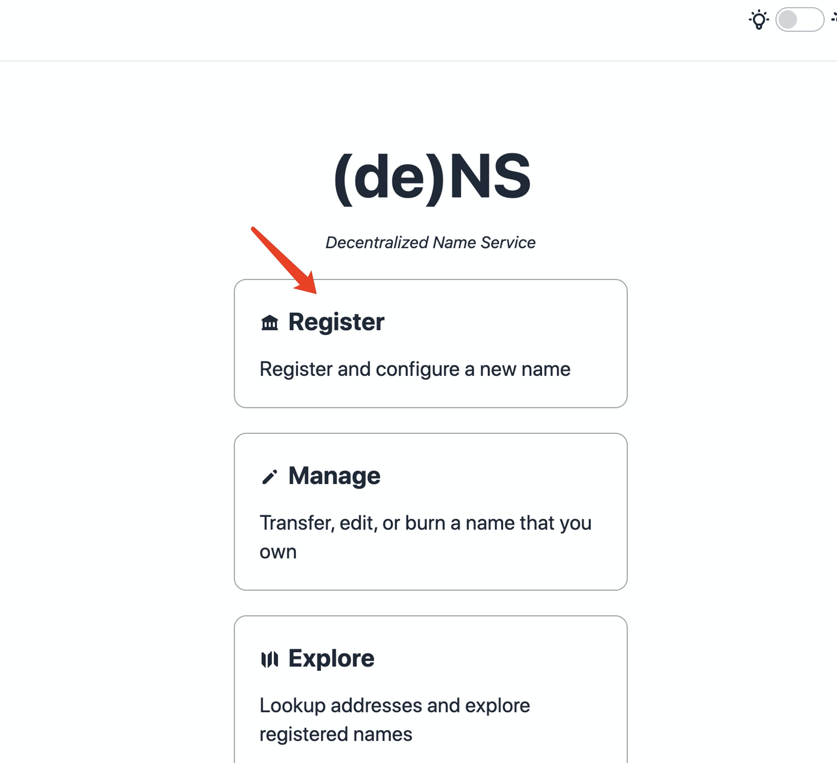 进入https://dens.vercel.app/ 连接钱包 点击左上角(de)NS注册