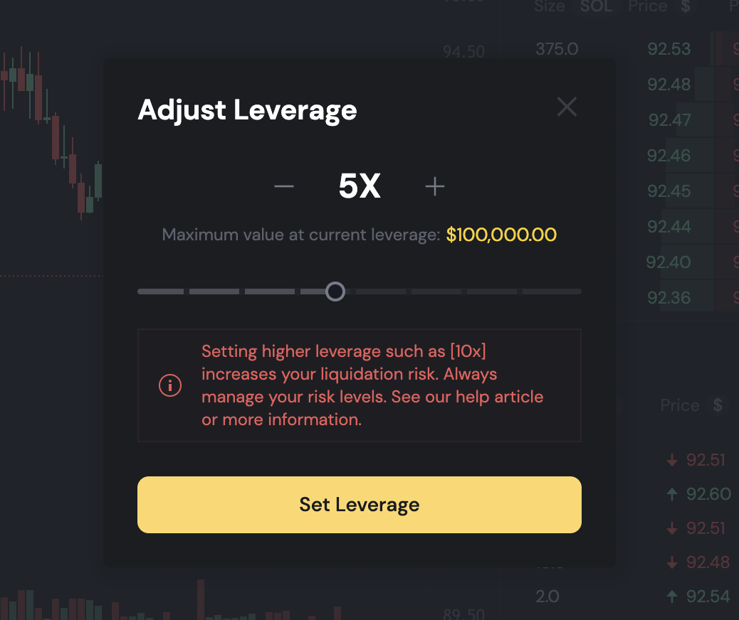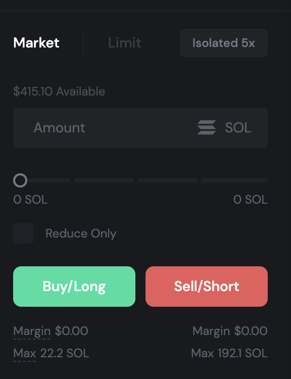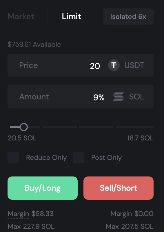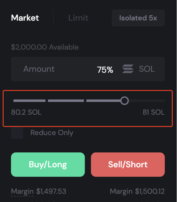 11 选择开单数量,可滑动选择百分比(官方设置了最大开单数量不能超过100个,所以选择开单仓位时要注意SOL的数量控制在100以内)