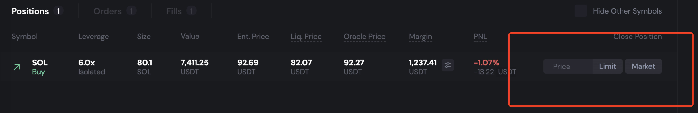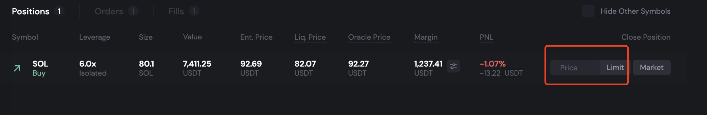 21 平仓点击当前仓位最后边,你可以选择市价平仓或者输入你设置的价格进行limit(限价)平仓