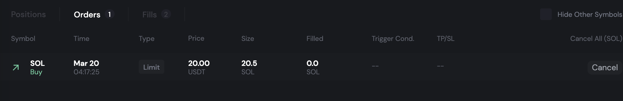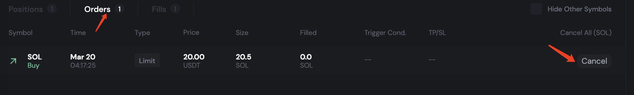 20 限价开单后,可以在orders看到你刚刚的限价委托,如果你想取消委托,点击最右侧的cancel
