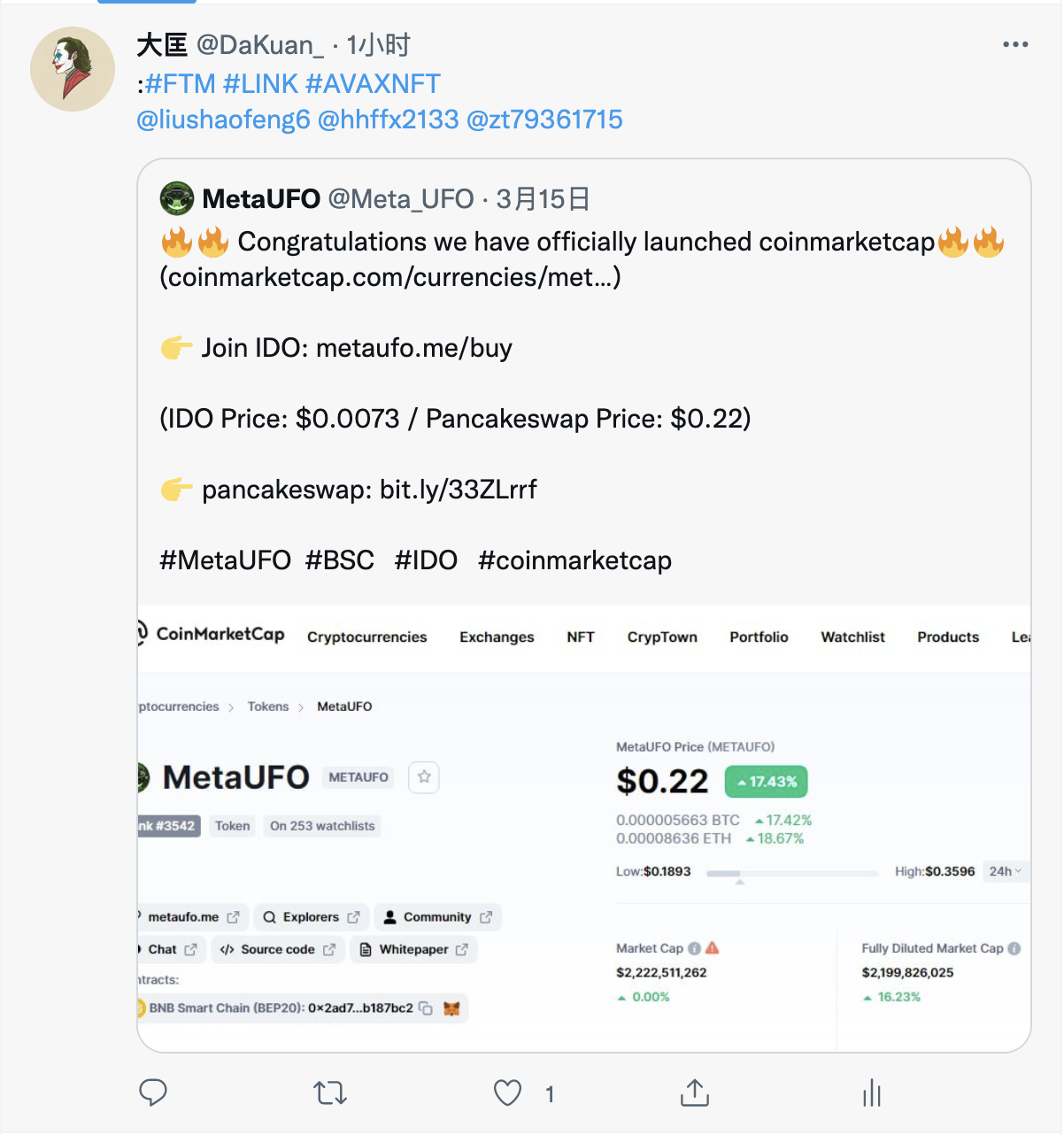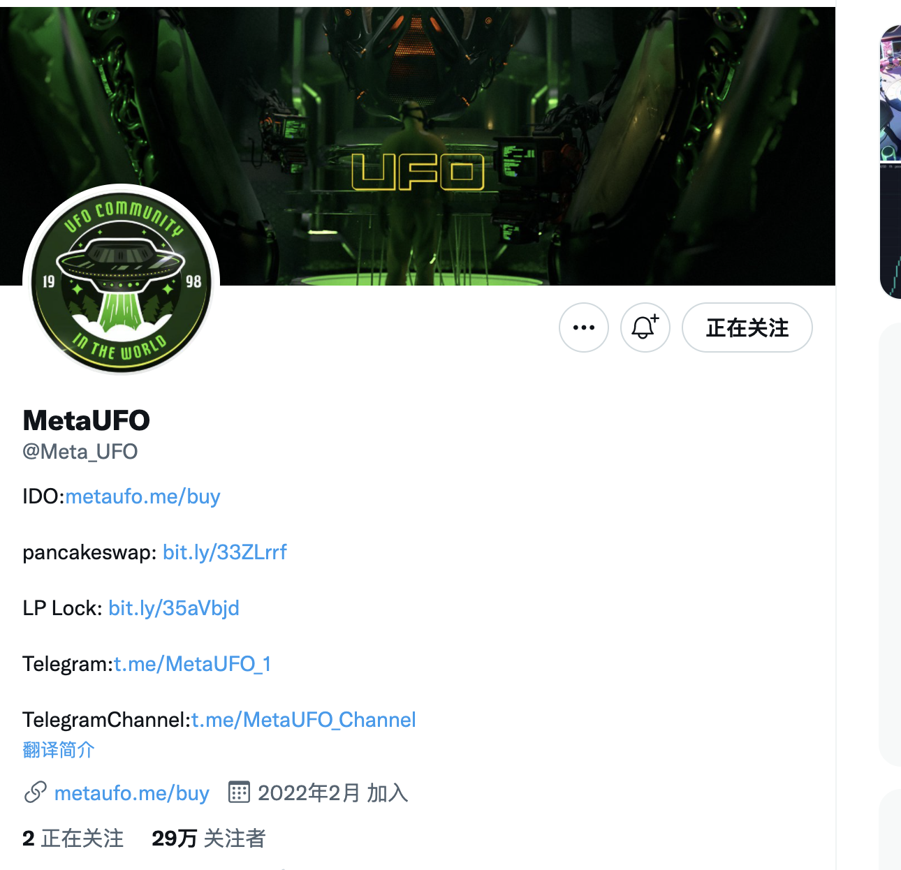 MetaUFO基于币安智能链,建议您使用Trustwallet或Metamask钱包参与IDO。目前流动性池子超100000。以上pancakeswap官方粉丝29万,可以撸一下。(建议用空钱包)
