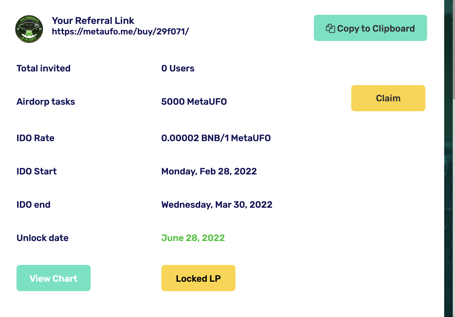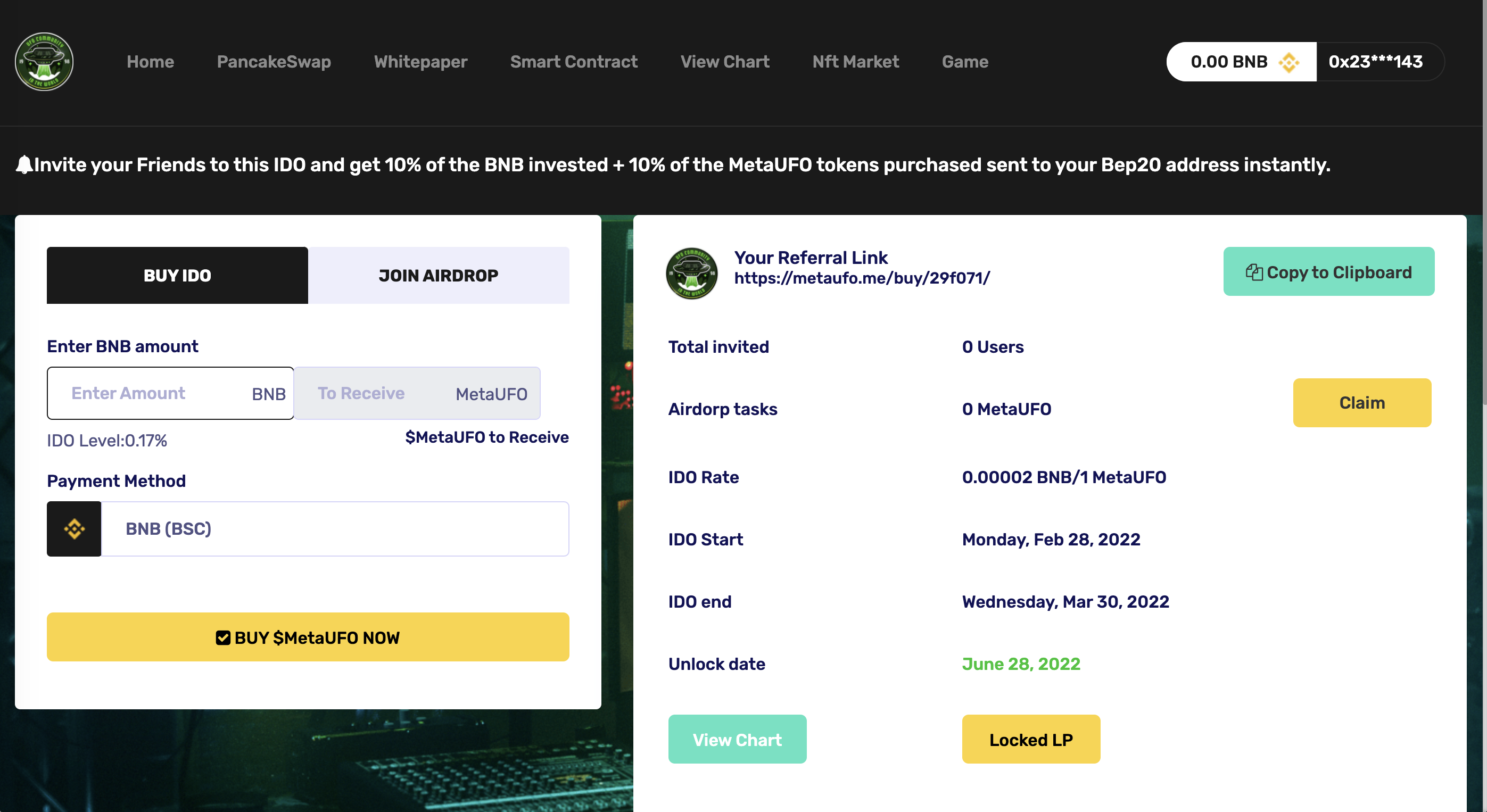 MetaUFO 是一个去中心化的游戏平台,具有游戏赚钱元素、NFT、其自己的 NFT 集合以及自动战斗器。MetaUFO 基于公平启动,但使用通过 IDO 获得的软顶资金执行,旨在确定初始上市价格并赢得投资者的信任。IDO 或 IDO 将继续进行,直到达到硬上限,此时筹集的现金将用于平衡流动性,进一步提高价格。