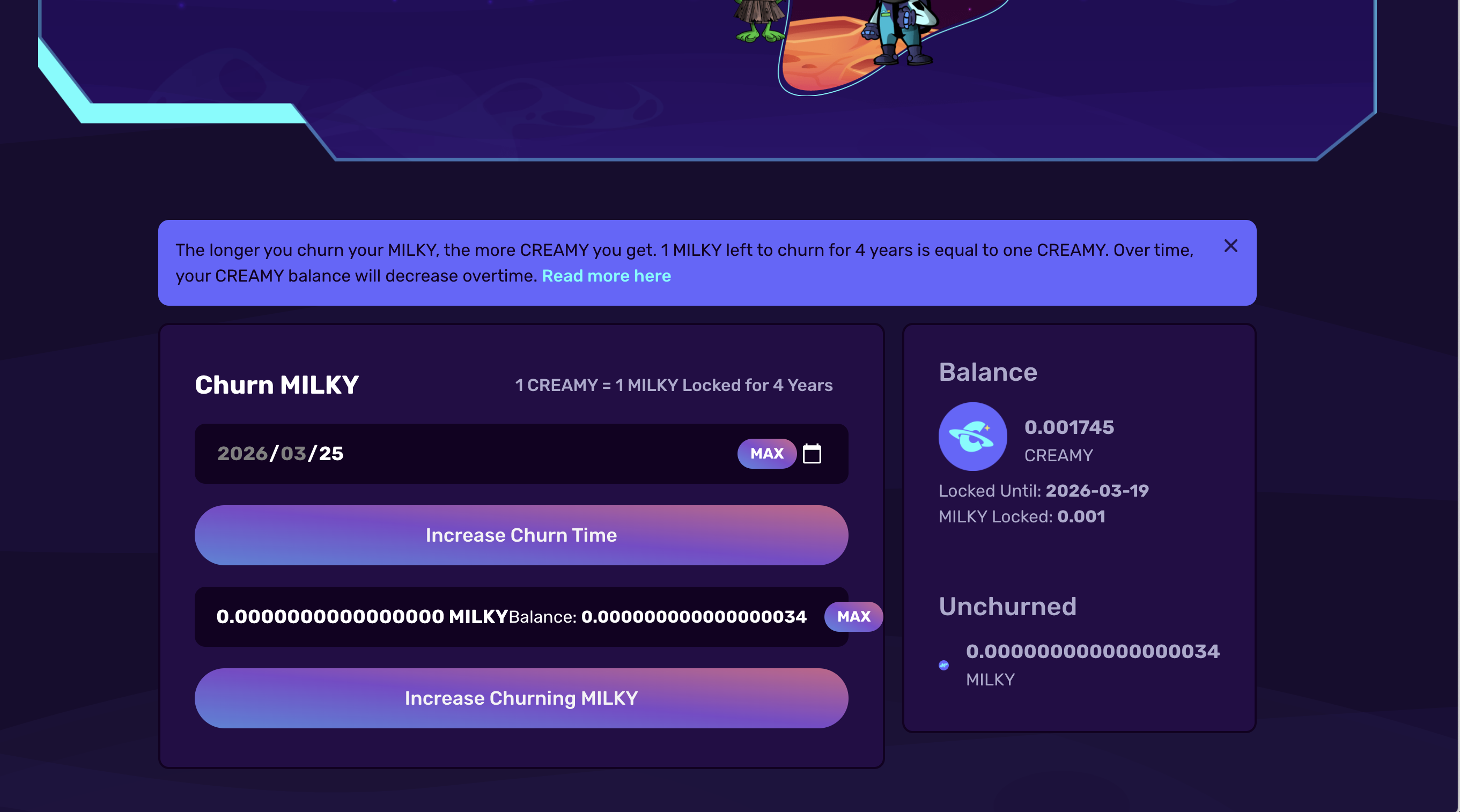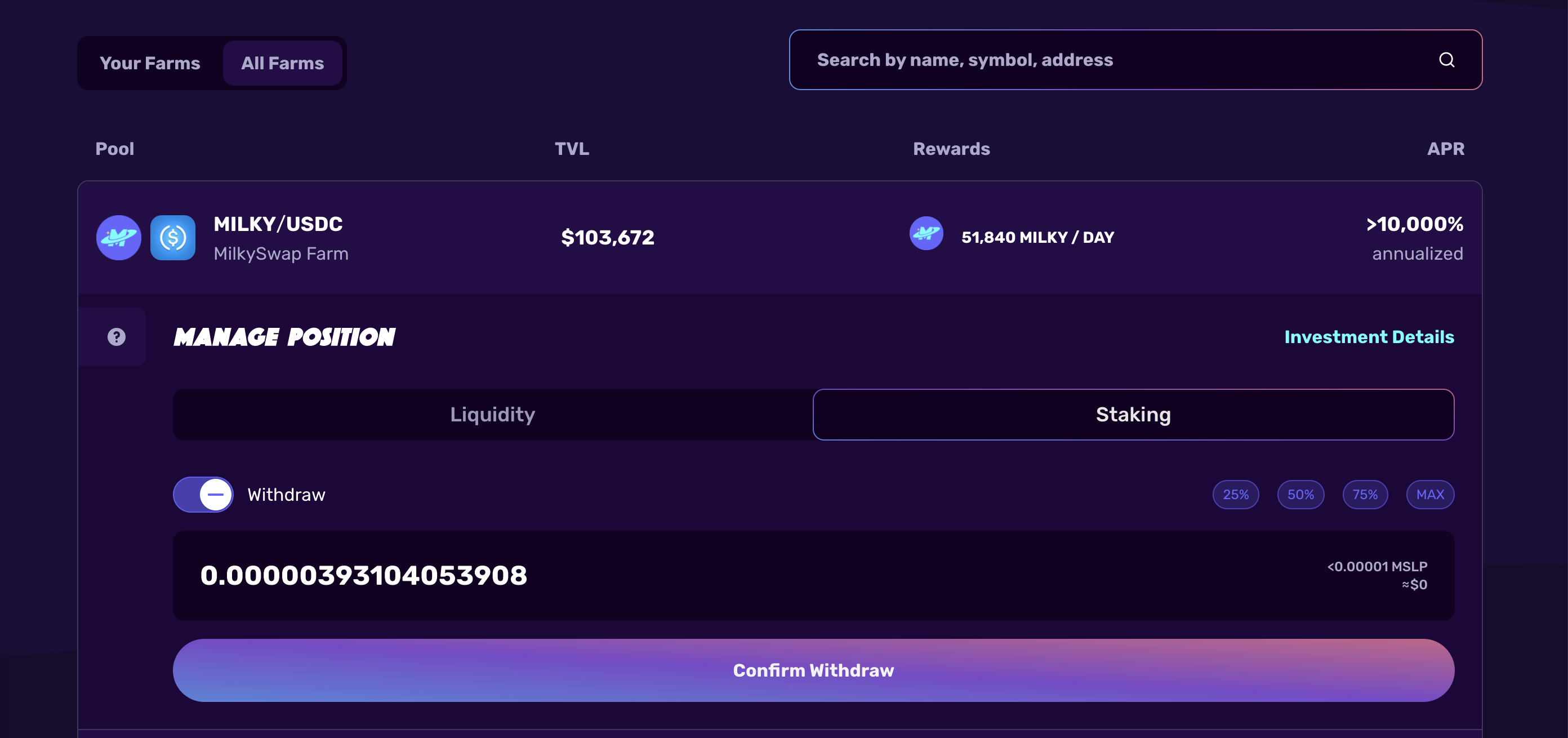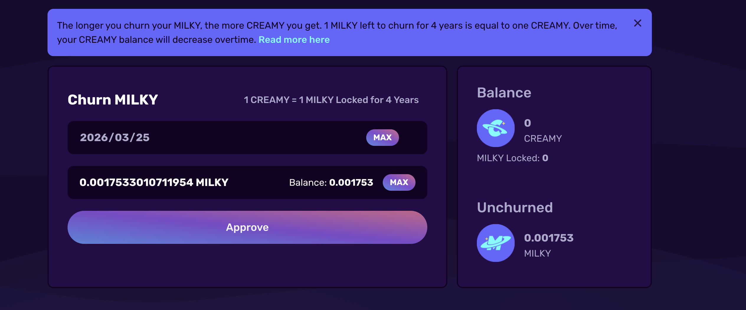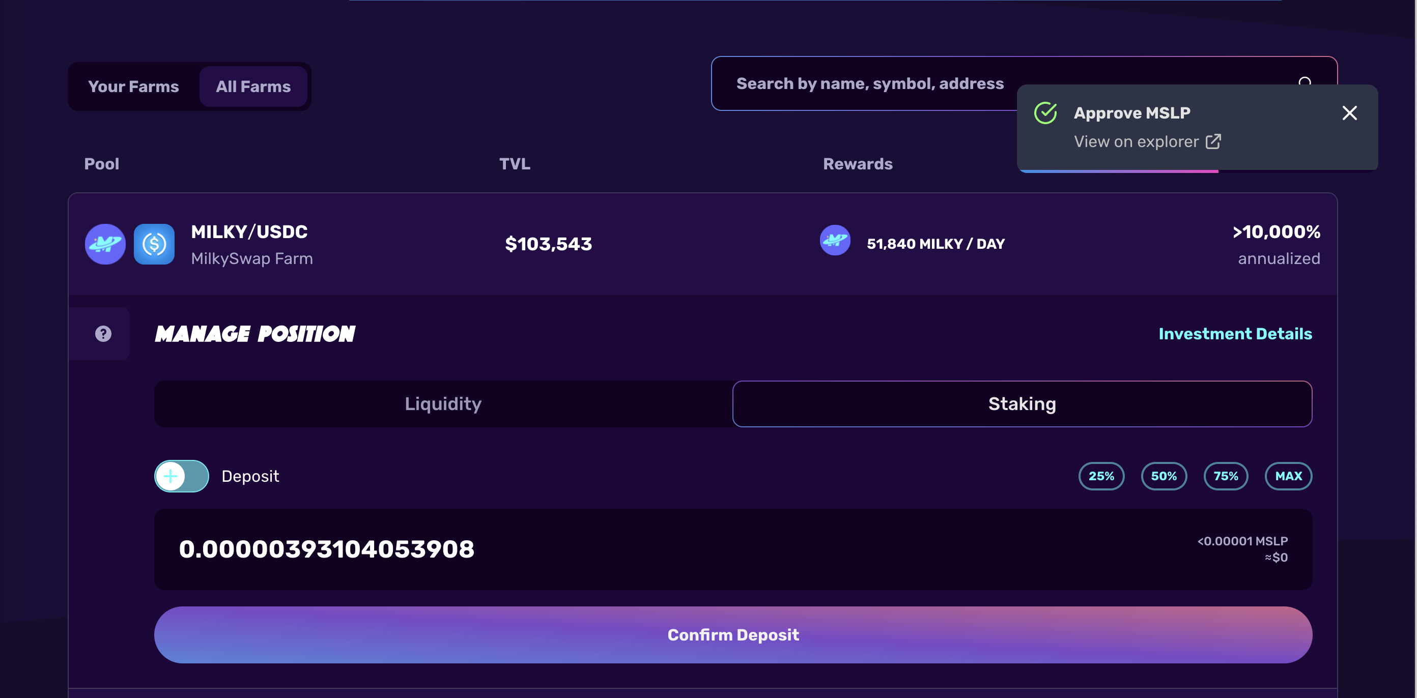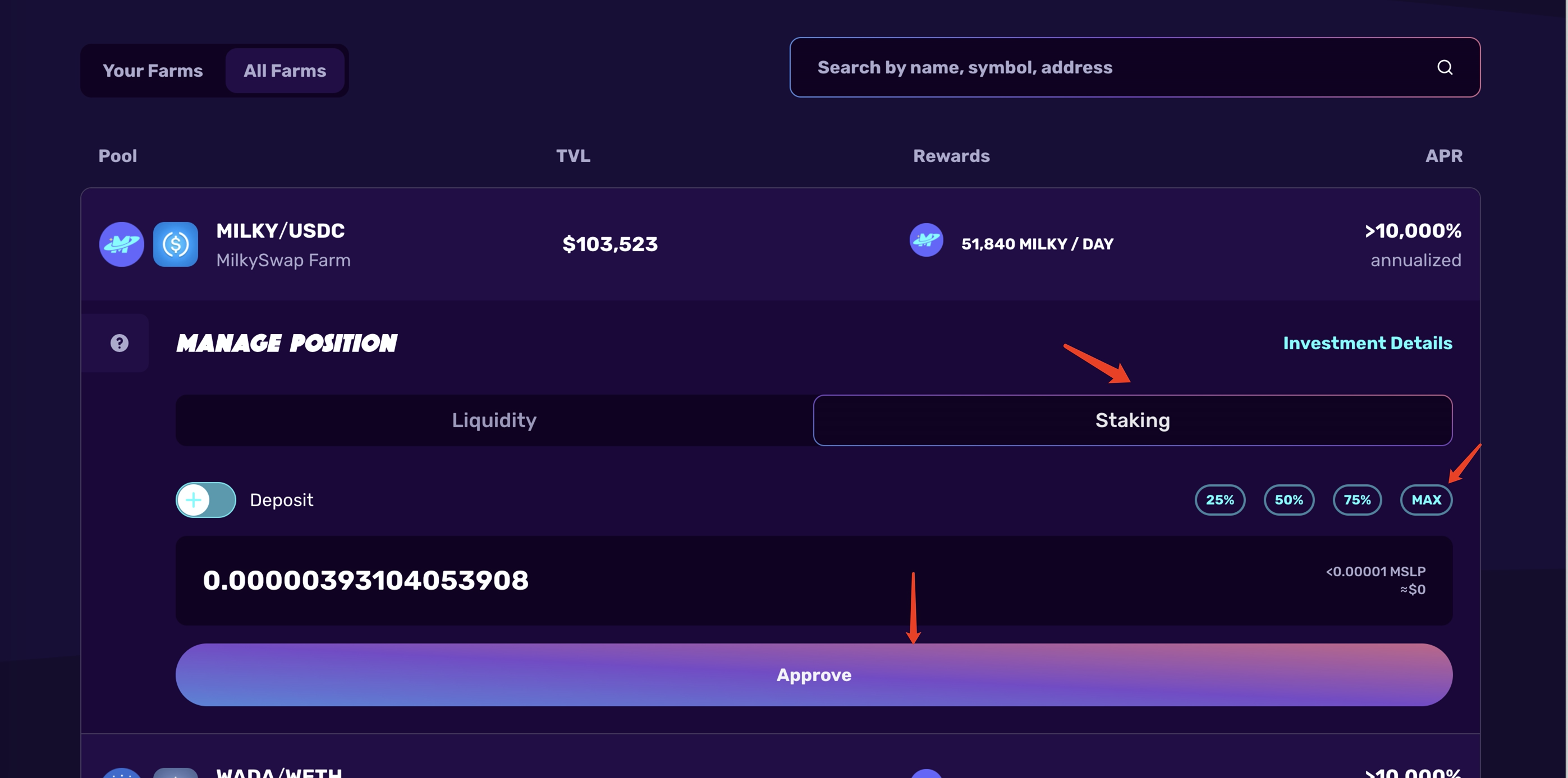 质押 LP 代币以赚取 $MILKY。点击“Staking”。