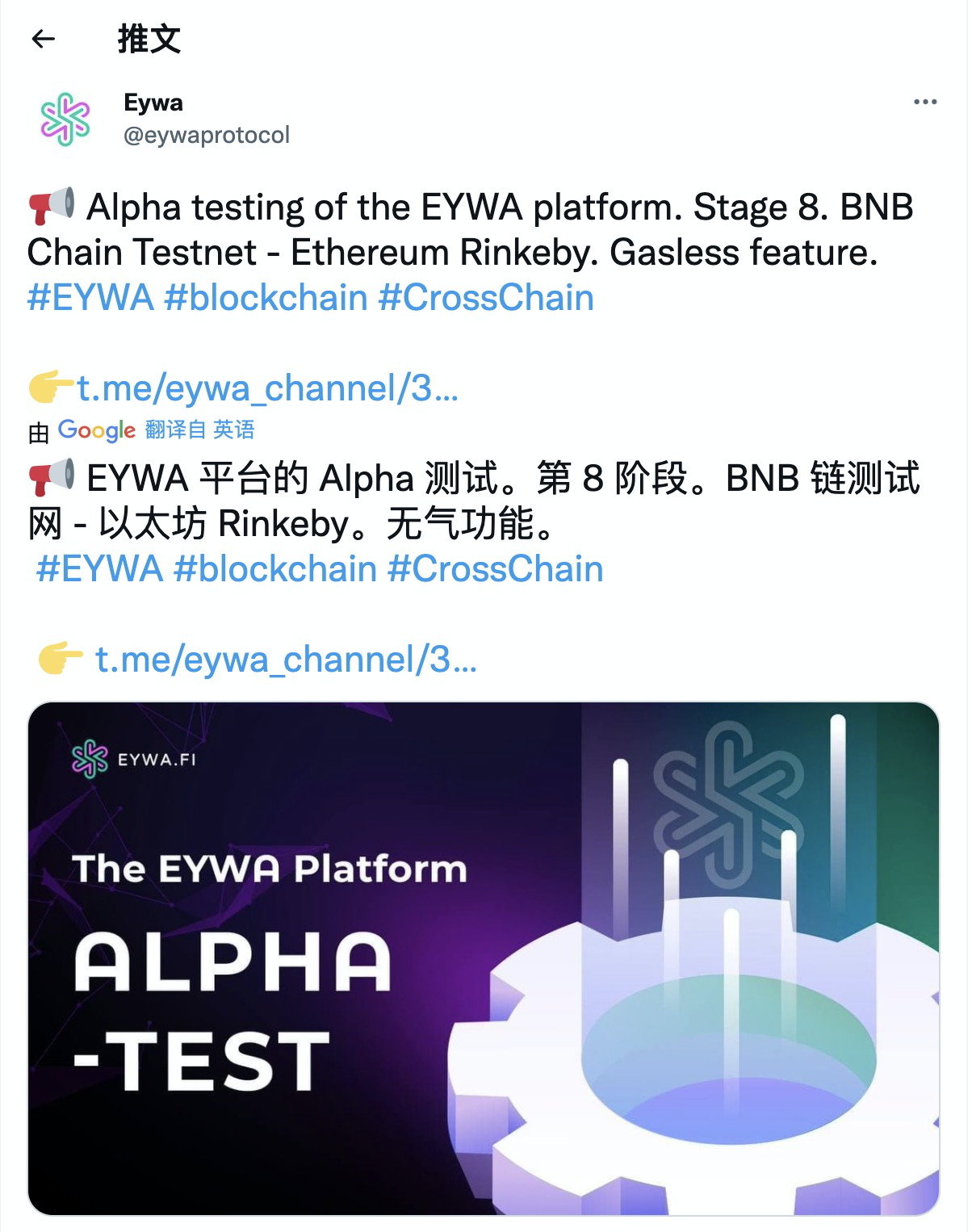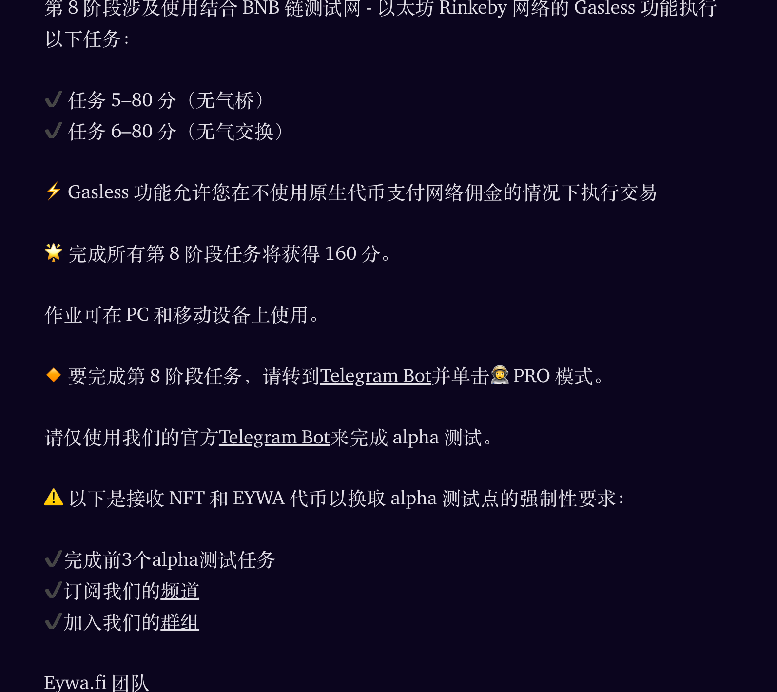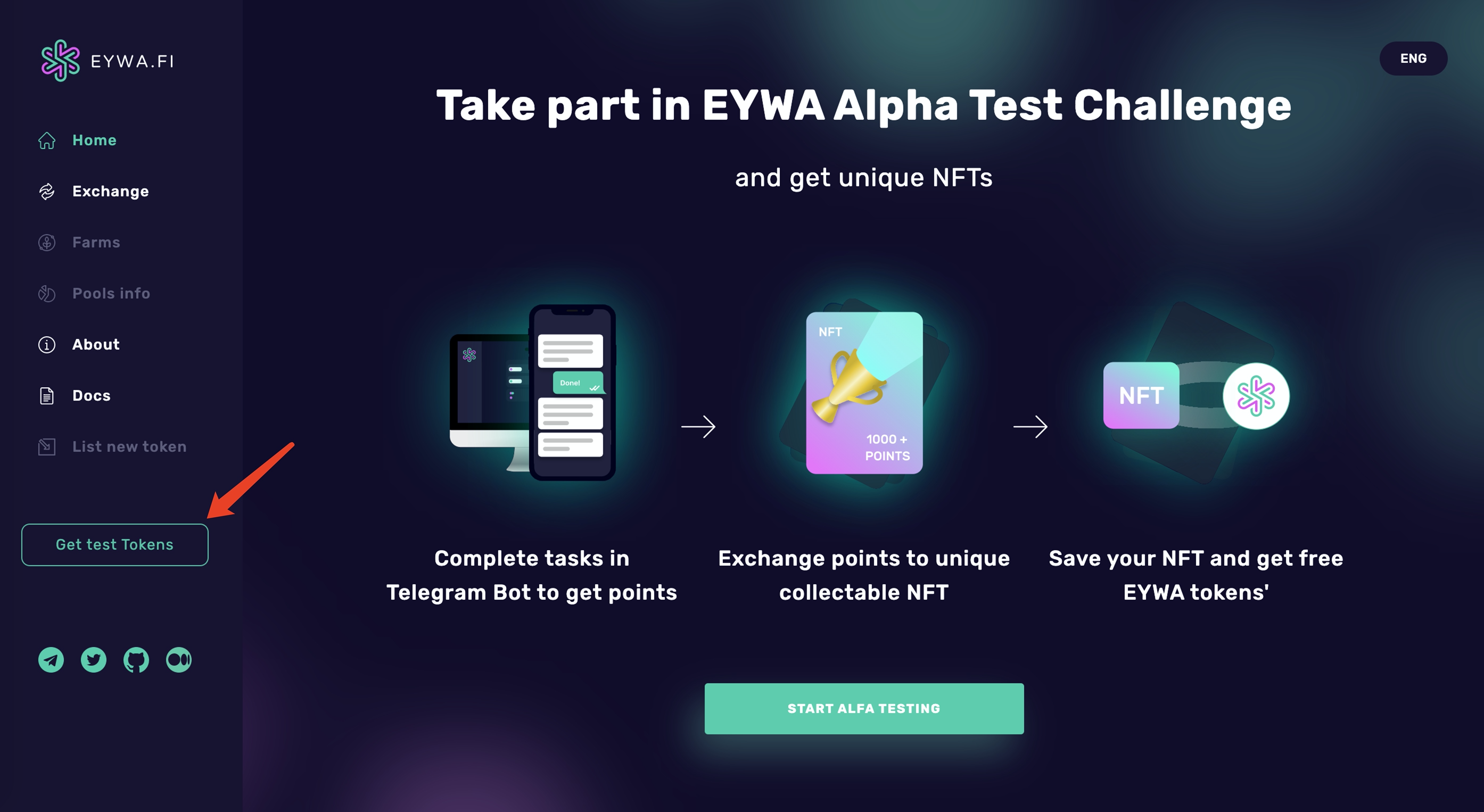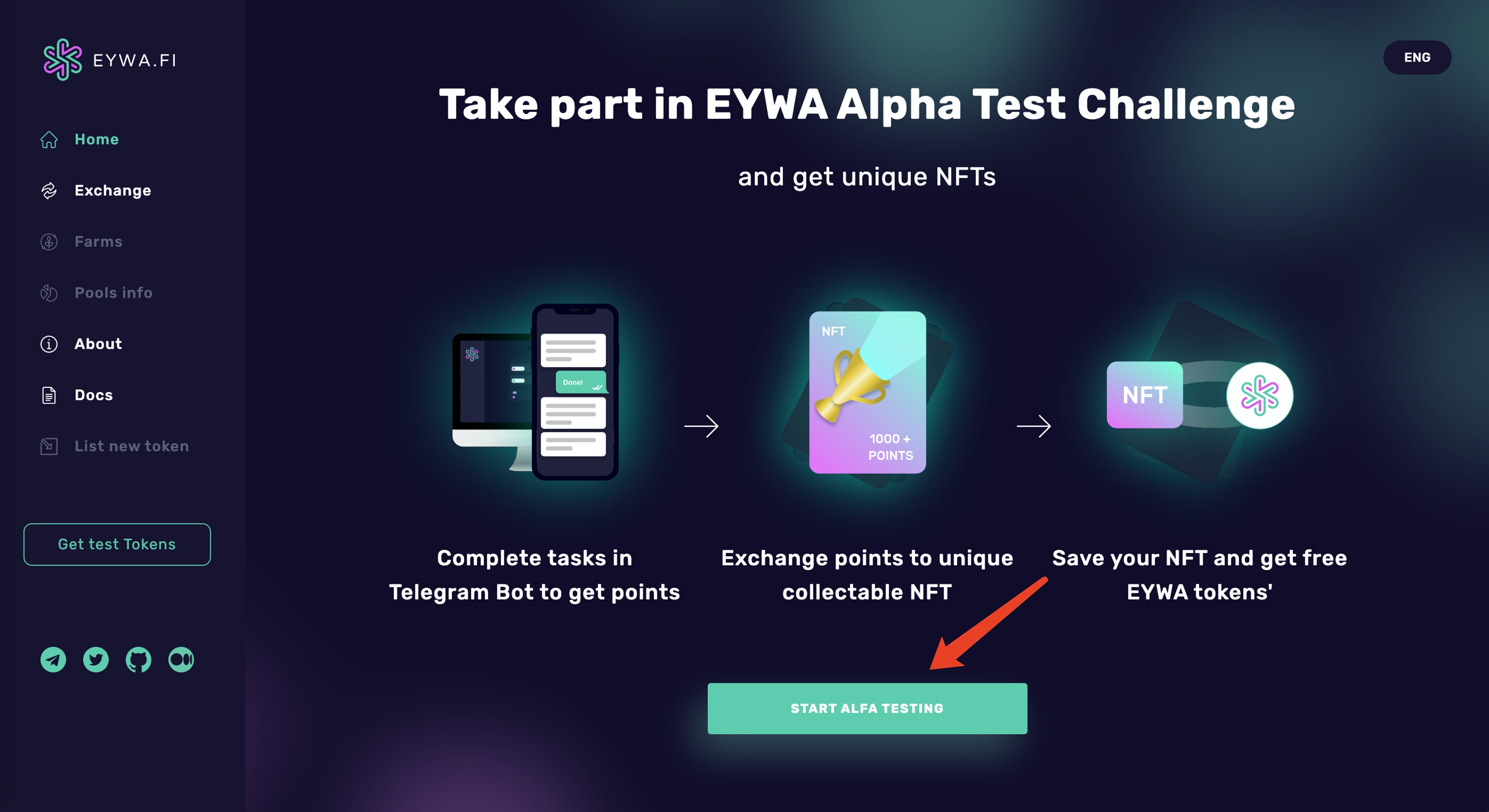 1)进入测试网,点击START ALFA TESTING跳转电报登记(按照机器人要求完成任务,有机会获得NFT空投EYWA代币)