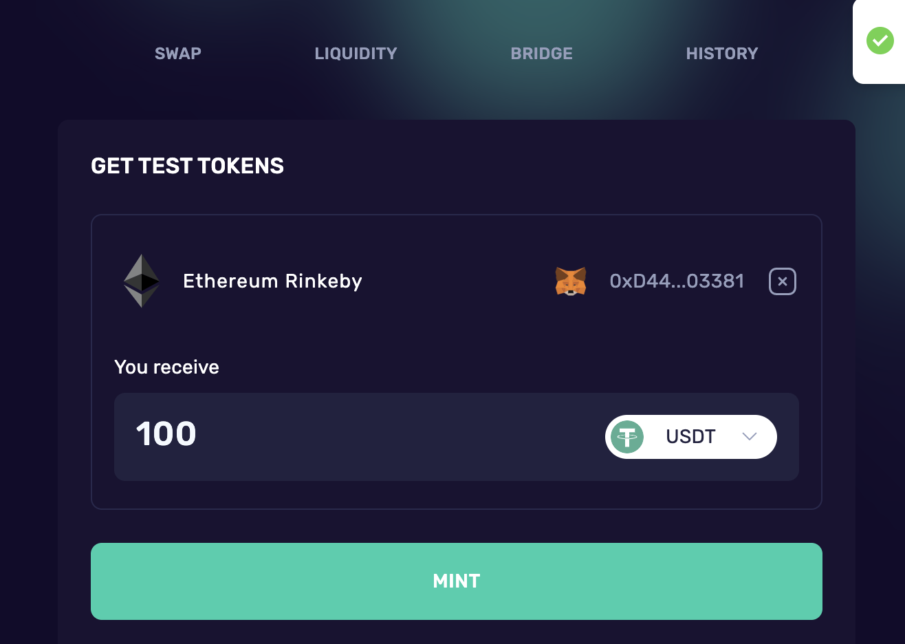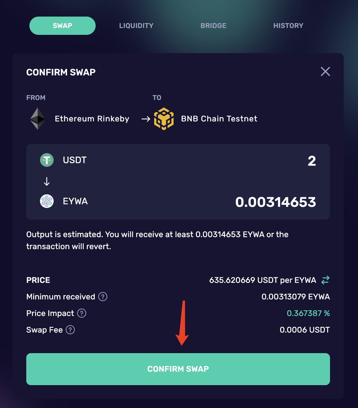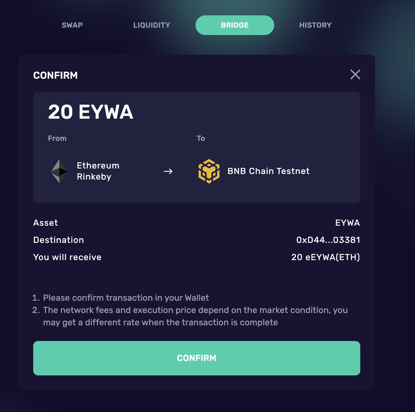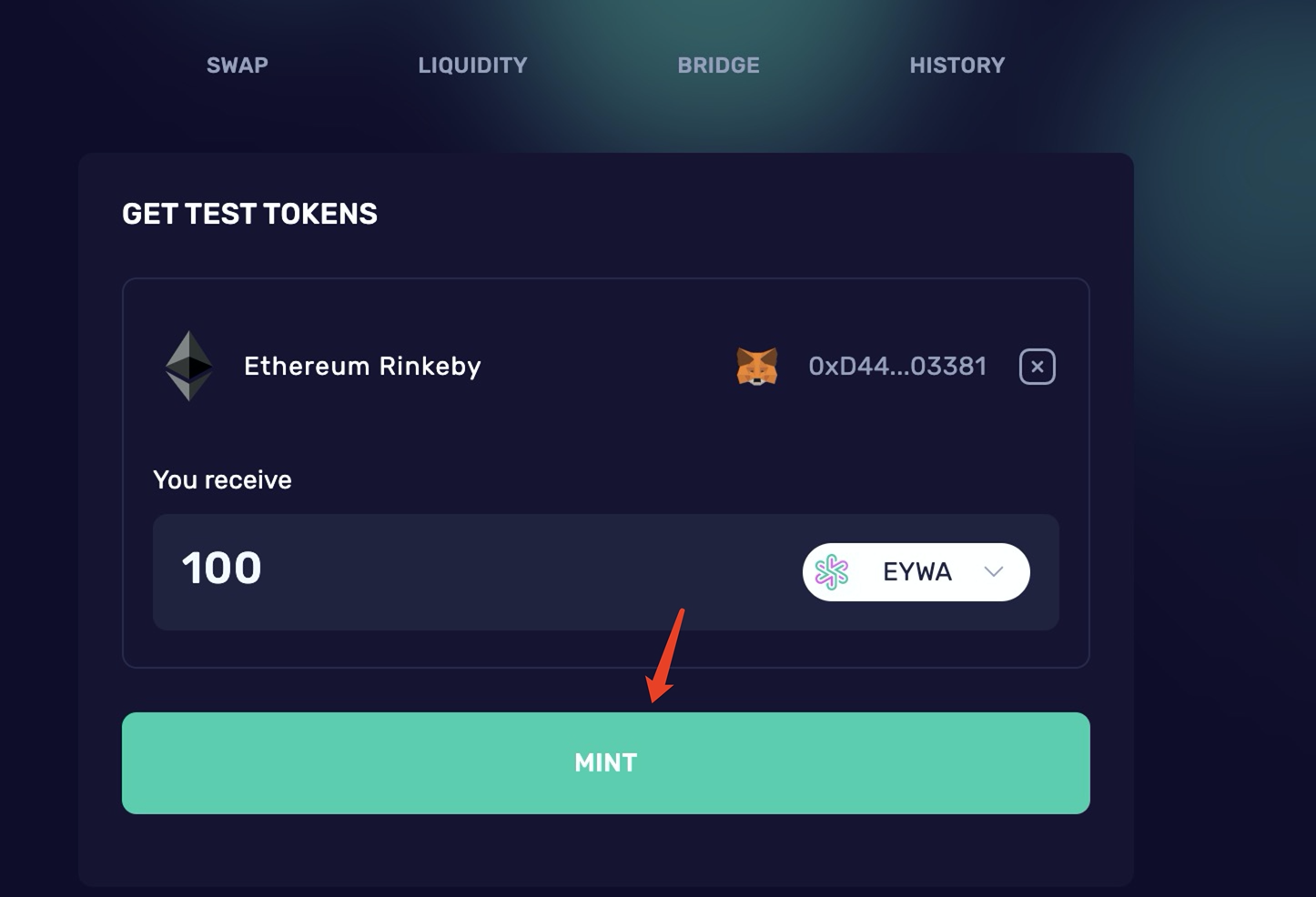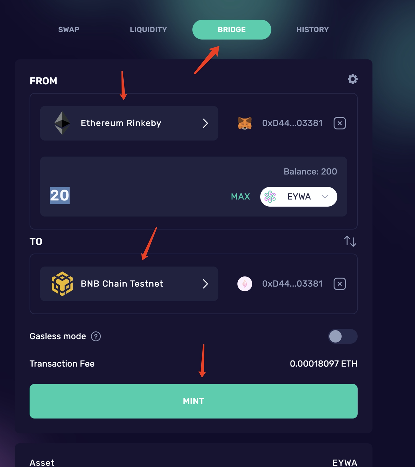 5)跨链桥(选择bridge,从rinkeby跨链到bnb,选择币种EYWA,输入数量后点击mint)