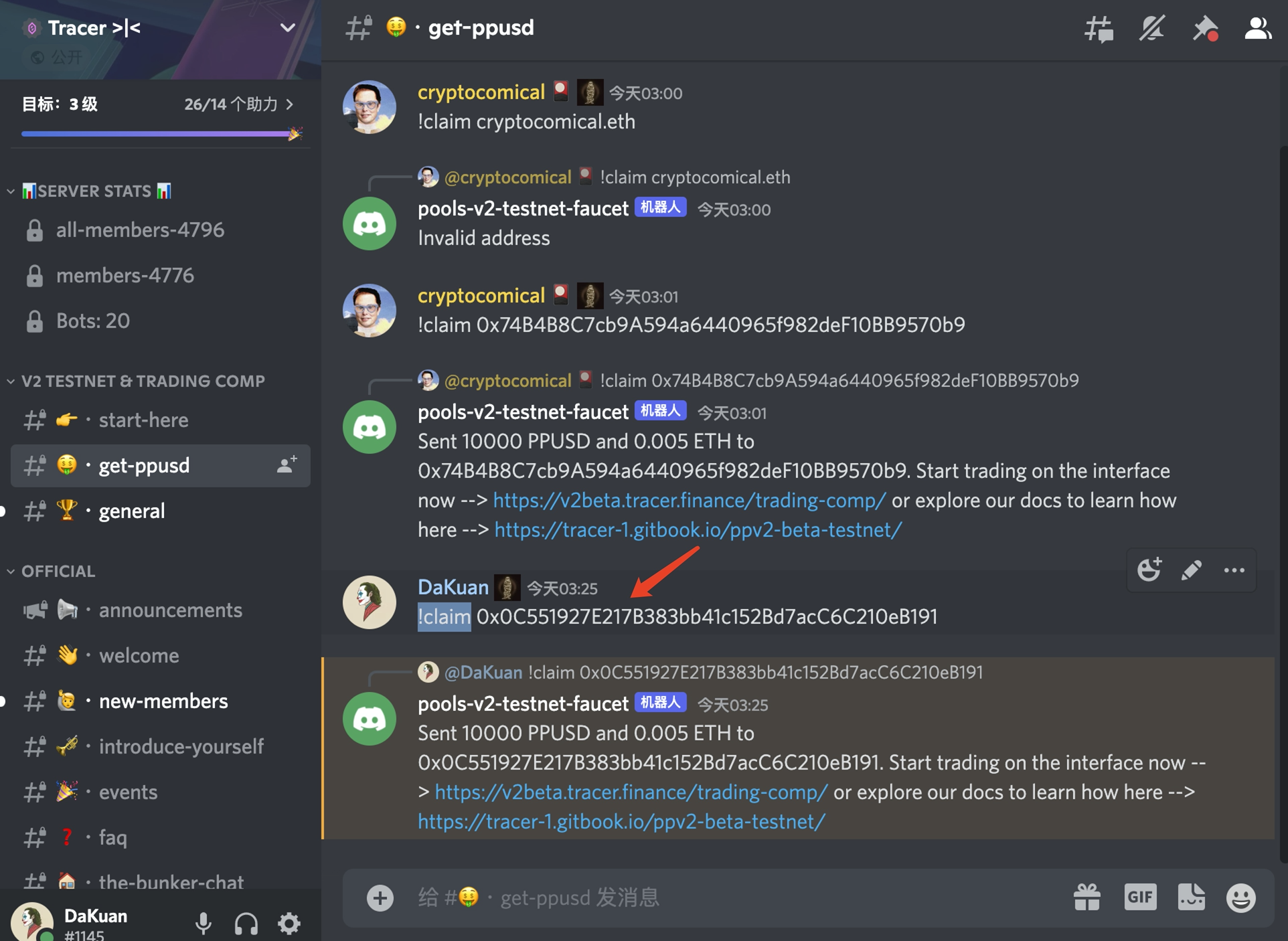 进入官方dc群,先验证然后到 get-ppust频道输入指令!claim➕钱包地址领取10,000 PPUSD和 0.005 ETH。