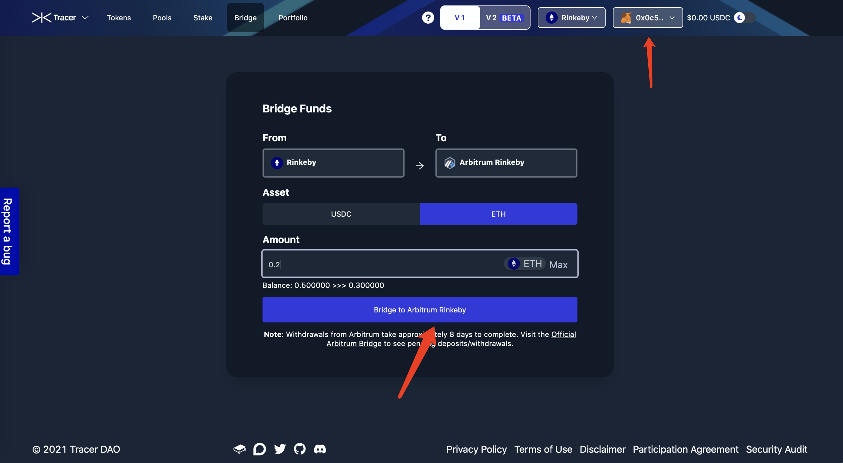 4 进入跨链桥,将ETH从Rinkeby跨到Arbitrum Rinkeby。先连接钱包,记得留一点ETH做gas费