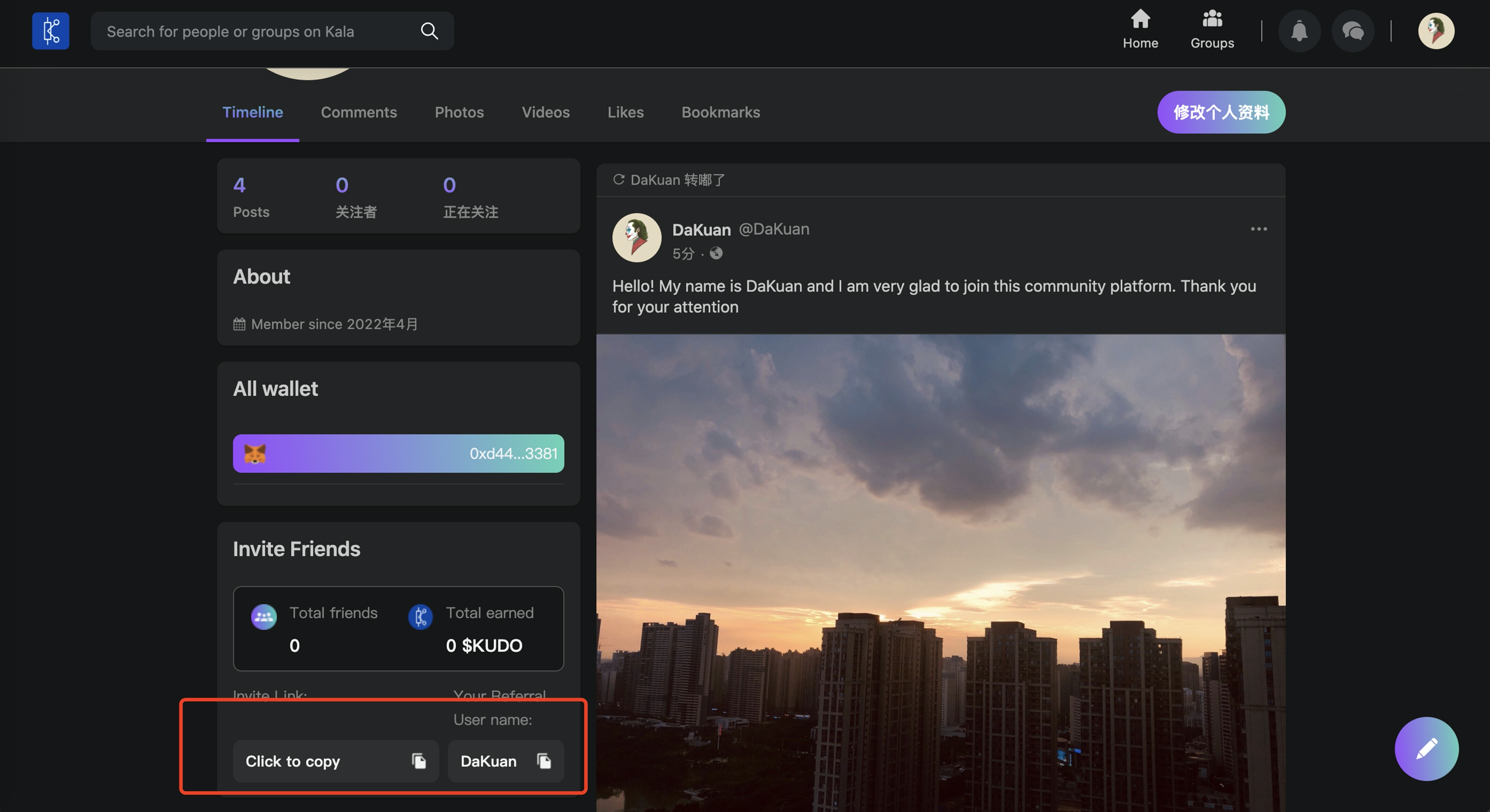 你每邀请一个人可以赚取 $0.5 KUDO。(你邀请的朋友也可以获得 0.5 美元的KUDO)