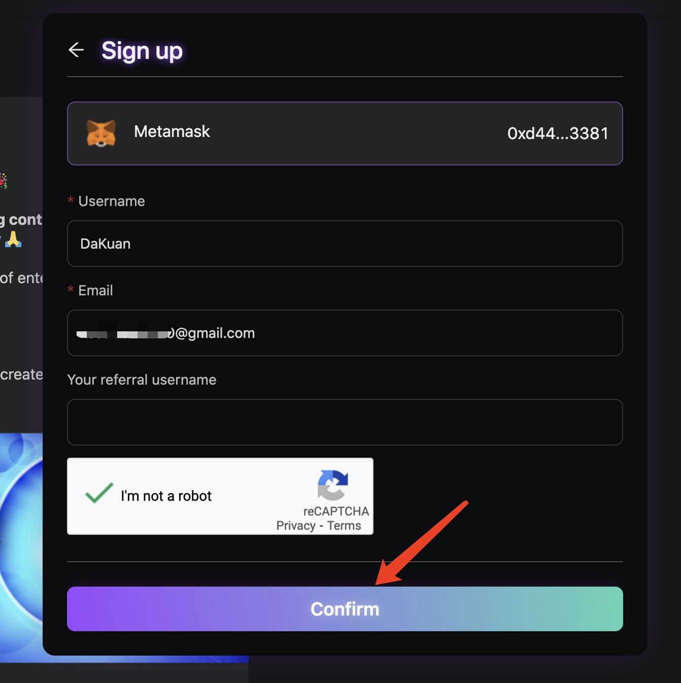 3 填写用户名和电子邮件。(如果你使用推荐链接,将自动填写邀请您的人的用户名)