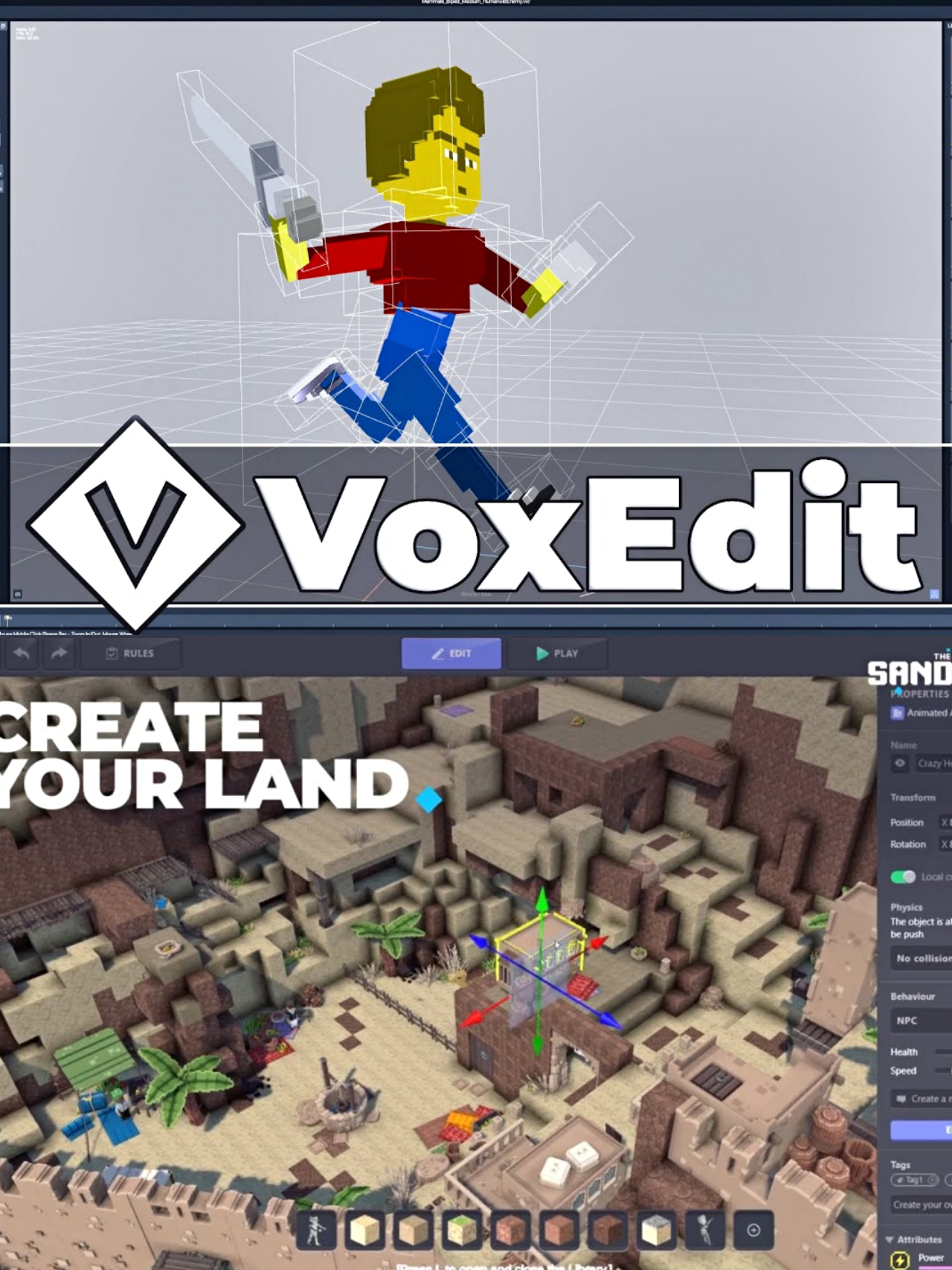 Roblox给开发者提供的支持在于平台为创作者提供工具帮助开发游戏,且作为流量入口为游戏倒流。参照Roblox,Sandbox为创作者提供了两款创作工具。其中VoxEdit帮助游戏开发者创造体素素材(Asset)并放在市场上售卖,而Game Creator则帮助玩家搭建游戏场景、放置体素素材以及设计角色的动态效果等。