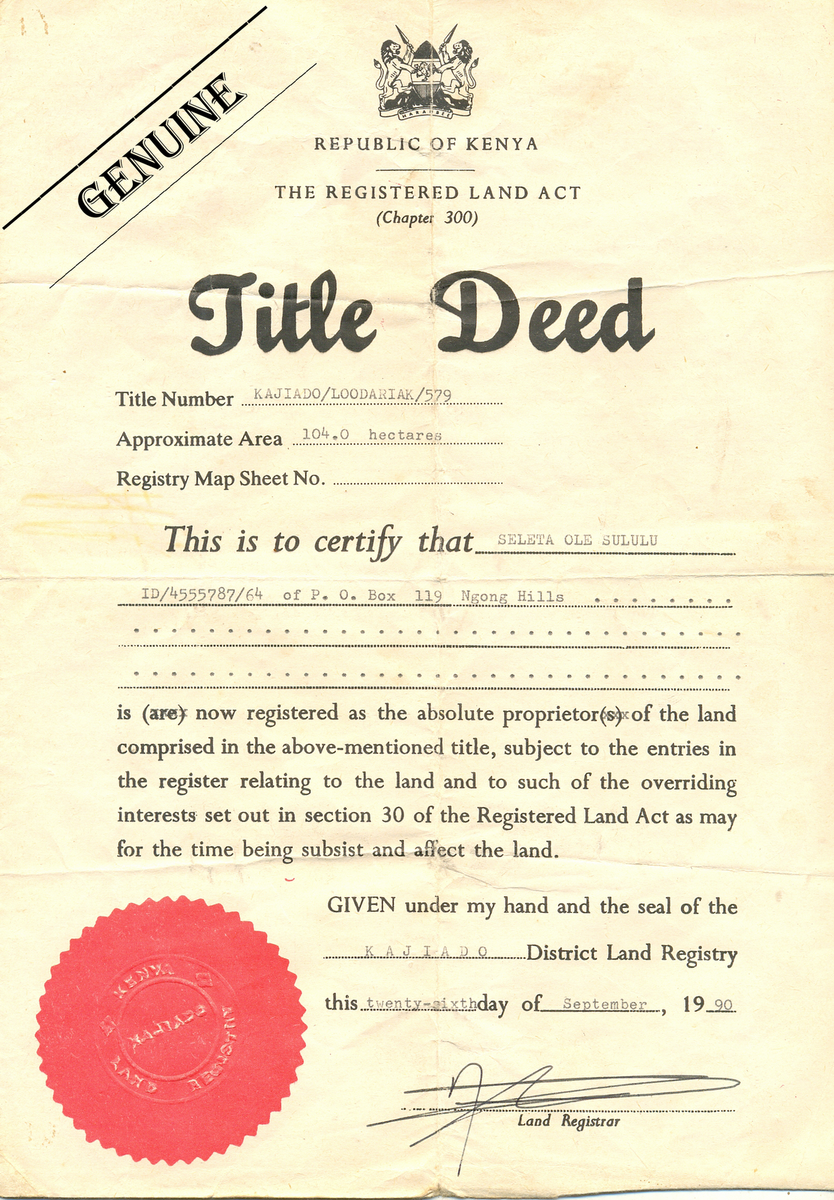 A deed from Kenya, conveying title to a new owner, above (commons.wikimedia.org) versus an NFT transaction recorded on an immutable ledger (blockchain), below (Otherdeed)