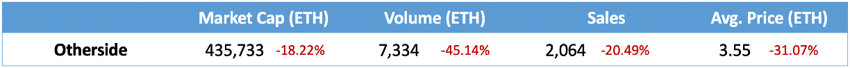 Otherside’s total land cap sunk 18.2% this month to round out the month at 435,733 ETH, dropping below half a million ETH for its first time. Following a 22% increase in its average ETH price in July (a month in which ETH rose 54%) things corrected this month, as trading activity had a significant drop. Top sales of prized Otherdeeds have been dropping off of late, with August seeing just 3 sales above 50 ETH, down from 5 in July and over 10 in June.