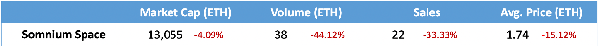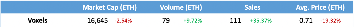 A top sale of 12.5 ETH on Aug 2 was just enough to see a 9.7% rise in trading volume for Voxels, but nothing else too positive. Sales were up for the month, but the average price fell 30% for a second month in a row, sending its market cap south another 2.54% to just 16,645 ETH, a number it last saw in November.