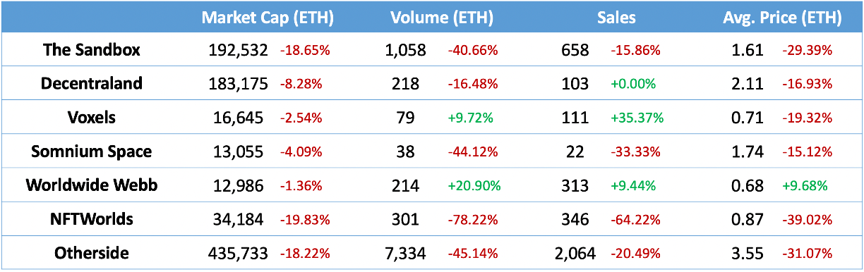Things did not bode well for the virtual worlds economies in August, with the aggregate land cap of all 7 metaverse projects listed on OneLand (The Sandbox, Decentraland, Voxels, Somnium Space, WorldwideWebb, NFT Worlds and Otherside) declining 15.85% to 888,309 ETH, or $1.378 billion. It represents a marked downturn from July’s decline of 9.9%, and an inversion of the global NFT market monthly result. Besides, it marks the first time the total land cap of the 7 projects has sunk below 1 million ETH since Otherside first entered the fray on May 1.
