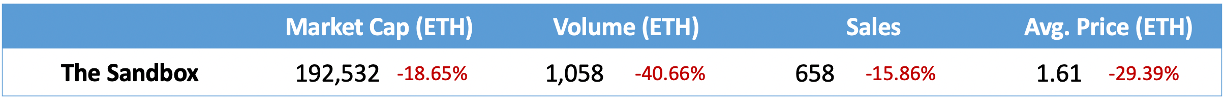 Trading volume for LANDs in The Sandbox continued to dive in August, down 40.6% on the back of a 30% drop in July. The average price of a parcel toppled (-29.4%) to end the month at a lowly 1.61 ETH, putting downward pressure on land cap which fell 18.6% to below 200,000 ETH for the first time since November. True — that was during a meteoric rise for The Sandbox, when the price of $ETH was triple what it is now, yet it only makes the comparison more telling.